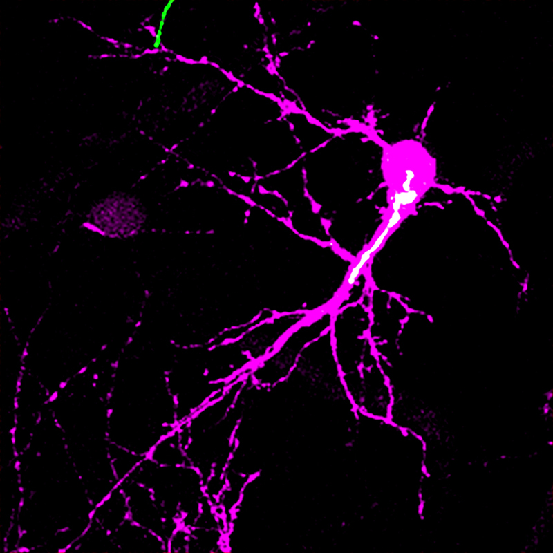 Figure: The image shows a spiny stellate neuron (magenta) and its Golgi apparatus (white) in the mouse barrel cortex at postnatal day 5. The study found that the Golgi apparatus shows a biased distribution in one side of the neuron only during the postnatal critical period of circuit reorganization. This lateral Golgi polarity instructs the direction in which the neuron expands its dendrites for establishing precise neuronal circuit.