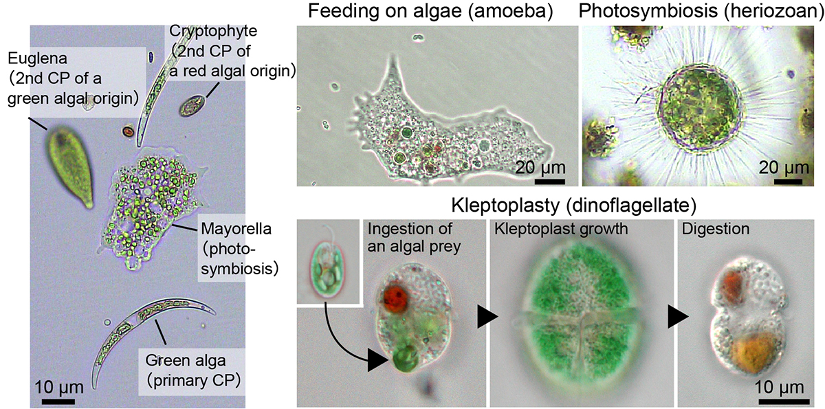 Figure: Examples of unicellular organisms with primary chloroplasts originating from cyanobacterial endosymbiosis, secondary chloroplasts from eukaryotic algal endosymbiosis, and organisms exhibiting phagotrophy, phototrophy, and kleptoplasty. Figure courtesy of Dr. Onuma (Kobe Univ.) and Mr. Okada (Nat. Inst. of Genet.).