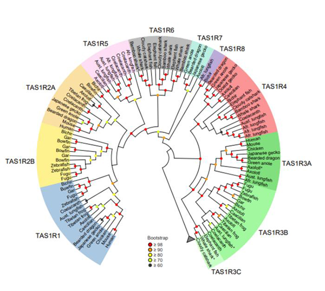 Figure: A new study led by researchers from Kindai University identified five new groups of umami and sweet taste receptors within the TAS1R family (TAS1R 4, 5, 6, 7, and 8) and also diversity in TAS1R2 and TAS1R3 genes.