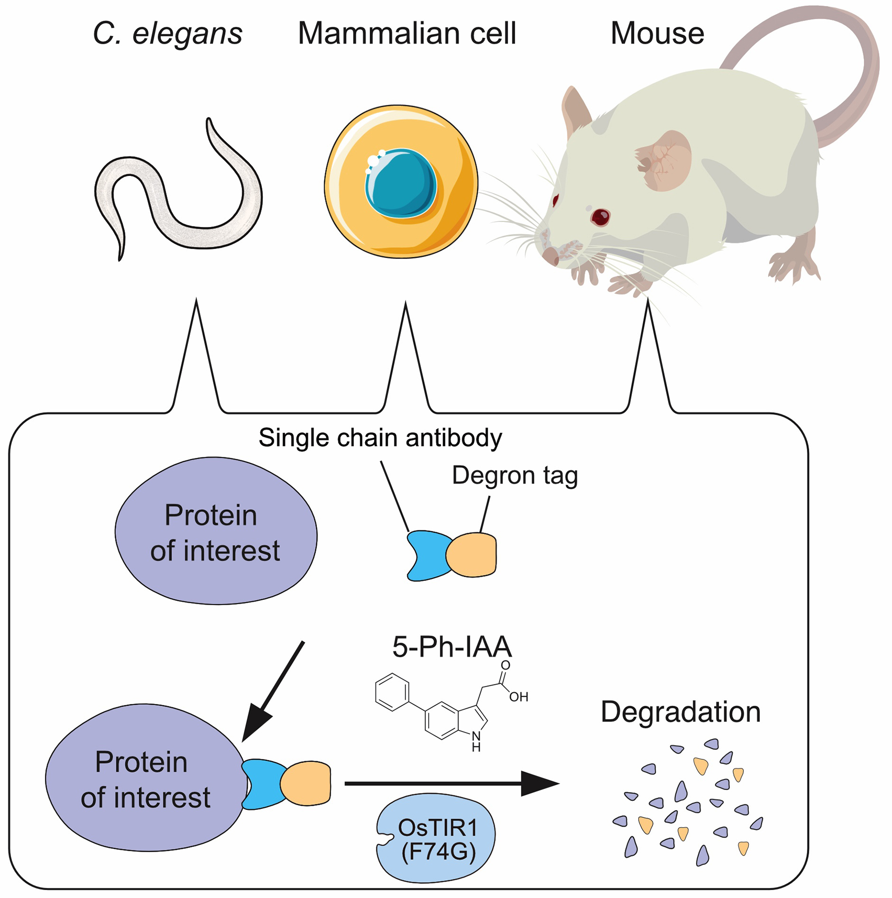 Figure: Single-chain antibody AID2 system enables degradation of untagged proteins in C. elegans, mammalian cells and mouse in a 5-Ph-IAA dependent manner.