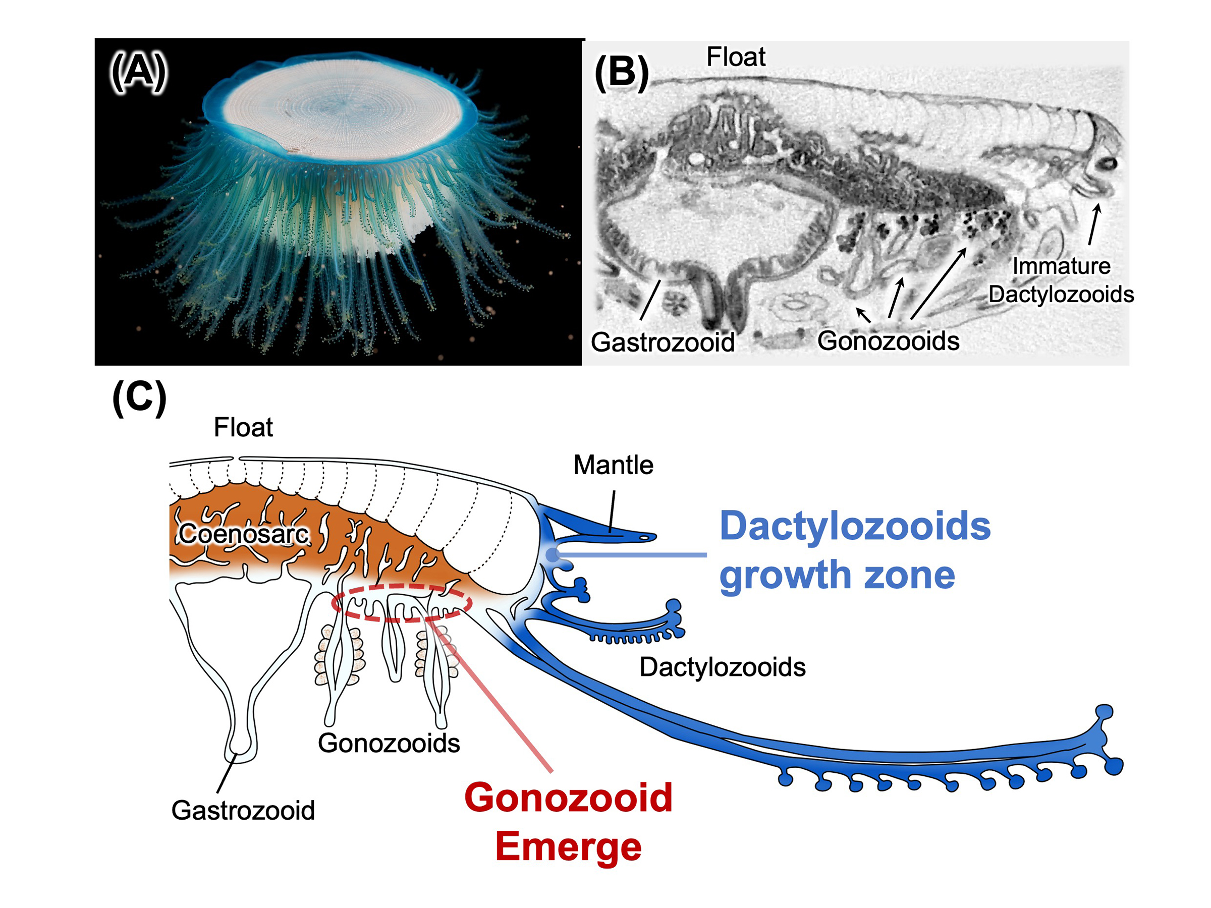 Figure: (A) Colony of Porpita porpita. (B) Cross-sectional image of the colony obtained by micro-CT. (C) Schematic diagram of the internal structure of the P. porpita colony as revealed in this study. Growth zones of dactylozooids are located along the colony margin, particularly at the base of the mantle, while those of gonozooids are widely distributed within the epithelium of the coenosarc.