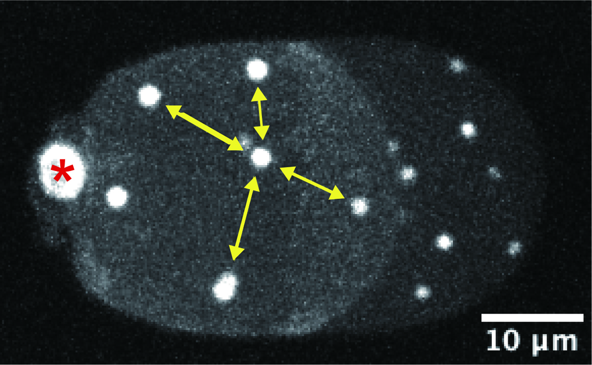 Figure: A representative microscope image of an enucleated, C. elegans embryonic cell. White signals indicate the centrosomes, which are evenly distributed inside the cell. (The image is a 2-dimensional projection of the 3-dimensional cell image. The asterisk indicates the polar body, which is not the centrosome.)