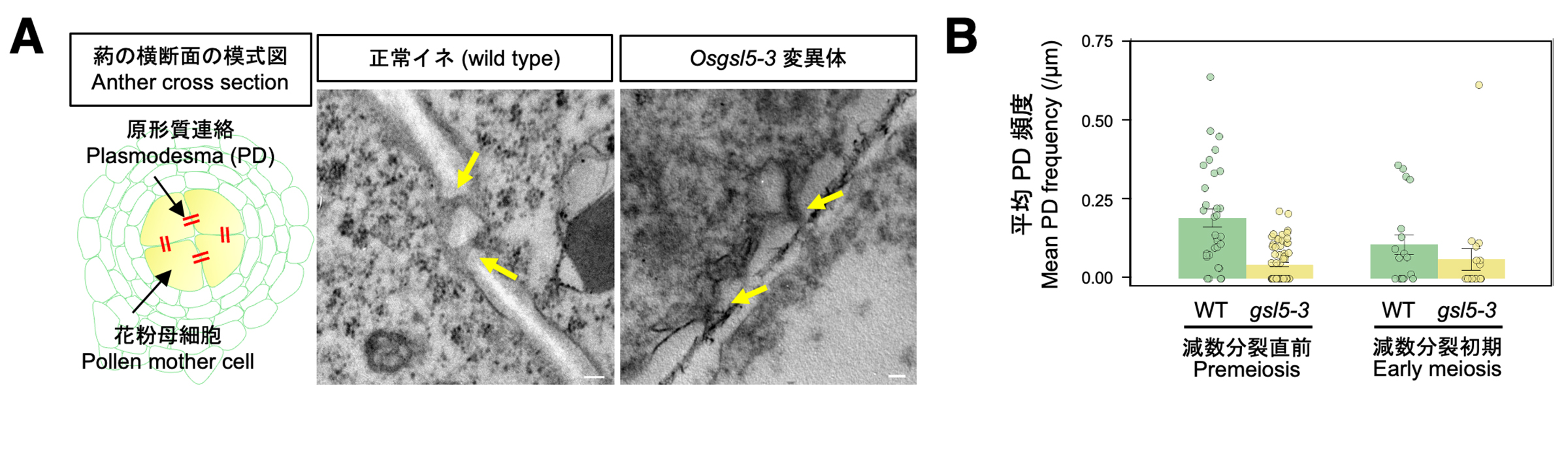 (A) A diagram of the cross section of rice anther (left), and transmission electron microscopic images of PDs (yellow arrows) between neighbouring pollen mother cells (PMCs) in wild type (WT) (middle) and Osgsl5-3 mutant (right).
