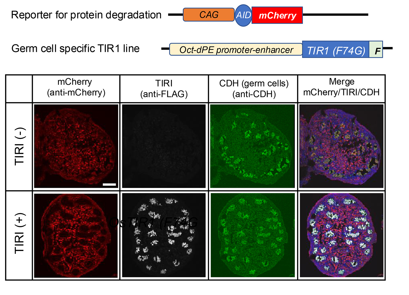 Figure: The germ-cell-specific TIR1 line was crossed with the reporter line TG-CAG-AID-mCherry. Immunofluorescence images of embryonic testes (E15.5) prepared from a pregnant CAG-AID-mCherrymother crossed with an Oct-dPE-TIR1(F74G)-FLAG male. TIR1(-) means sample without Oct-dPE-TIR1(F74G) and TIR1(+) means double transgenic sample. The mother was subjected to 5-Ph-IAA injection at E14.5. Antibodies used were anti-mCherry, anti-FLAG, and anti-E-cadherin (CDH). The scale bar indicates 100 mm.
