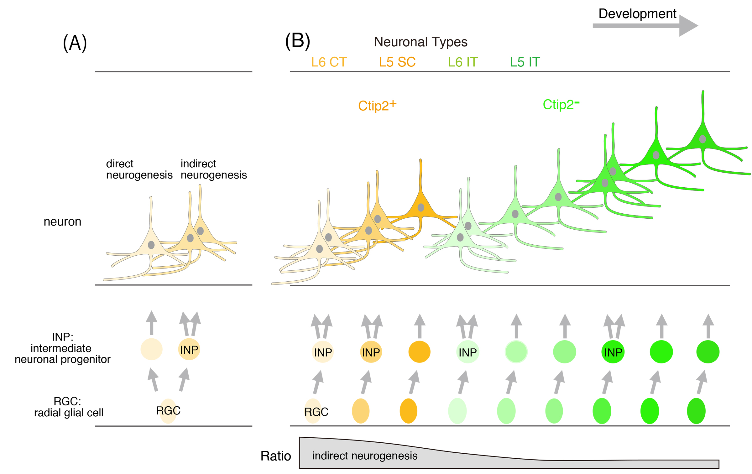 Figure: (A) Neurons are generated from radial glial cells (RGCs), which exhibit two distinct modes of division during neurogenesis: (1) direct neurogenesis, where an RGC directly produces a neuron, and (2) indirect neurogenesis, where an RGC generates an intermediate neural progenitor (INP) that subsequently produces neurons. (B) Indirect neurogenesis is particularly prevalent during the early stages of neurogenesis. Neurons generated through both direct and indirect neurogenesis differentiate into similar neuronal types in a temporally ordered fashion. Indirect neurogenesis likely functions to amplify the production of similar types of neurons efficiently.