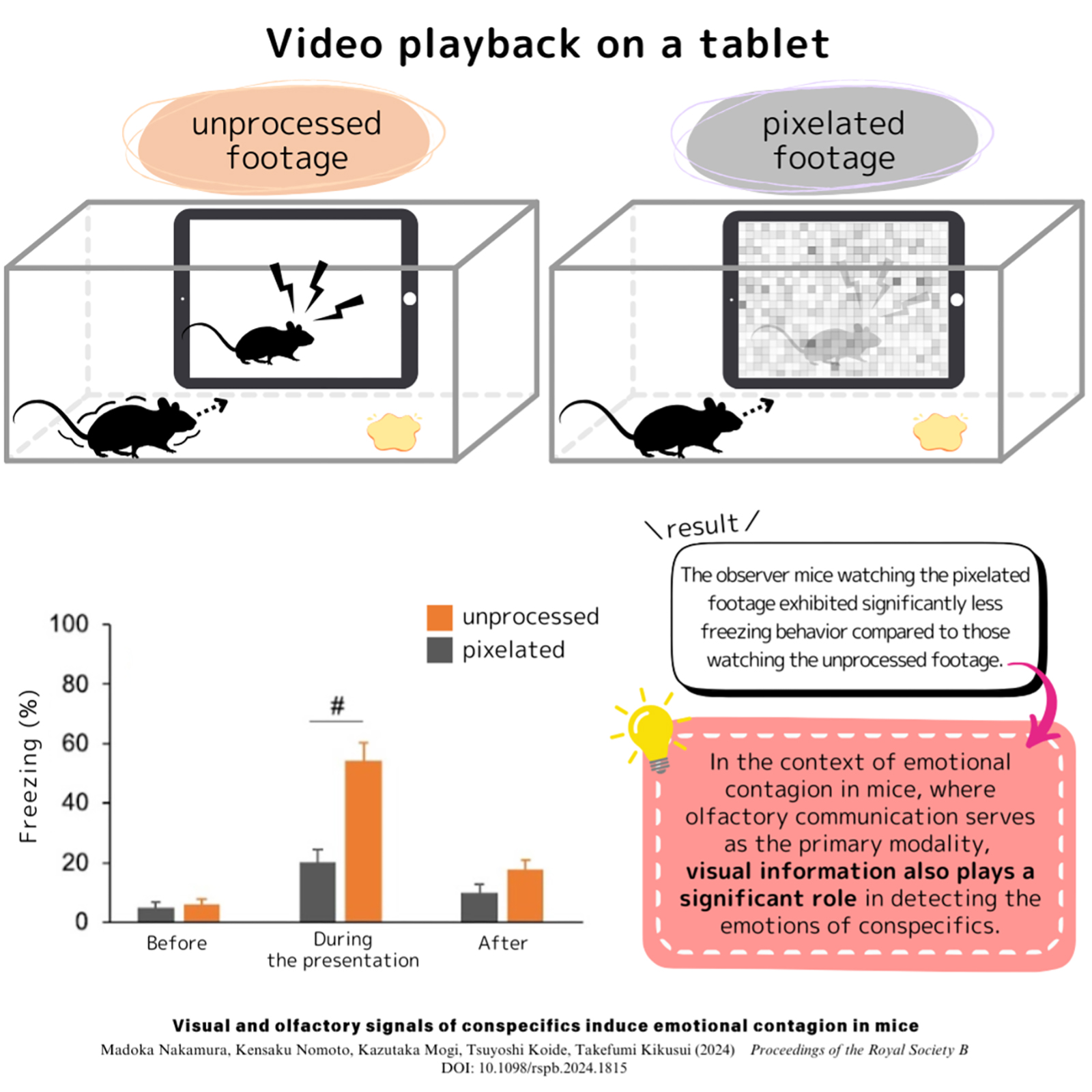 Furthermore, when mosaic processing was applied to the images, the occurrence of the freezing behavior was significantly weaker than when the mice were exposed to normal images without mosaic processing. This indicates that visual information as well as olfactory information is important for emotional contagion in mice. On the other hand, the importance of auditory information was not significantly affected by the absence of sound from the tablet, as the results did not differ from those obtained under the condition of sound.