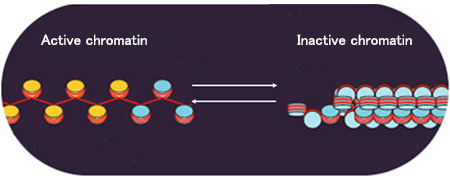 Once the chromatin structure became clear, how Drosophila gets white eyes was also elucidated. When histones are methylated at a specific site (K9), HP1 proteins bind to the methylated histones, which in turn recruit the histone methylation enzyme to methylate nearby histones. In this manner, histone K9 methylation and HP1 binding continues and spreads, causing chromatin to condense and inactivating DNA. Then, the white gene is inactivated, resulting in white eyes. Conversely, red eyes means the gene is activated, but its mechanism was not clearly known.