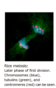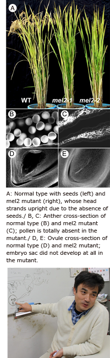 As a result of our study, we concluded that MEL2 is the master gene that regulates the timing of transition from pre-meiotic mitosis to meiosis. We believe that MEL2 regulates the cell division cycle of rice germ cells, specifically the beginning of DNA replication immediately before meiosis, and that this regulatory system is also used for the synchronization of meiosis in the anther. This seems to explain why MEL2 mutants can’t properly execute transition from mitosis to meiosis, resulting in loss of synchronicity and non-production of pollen.