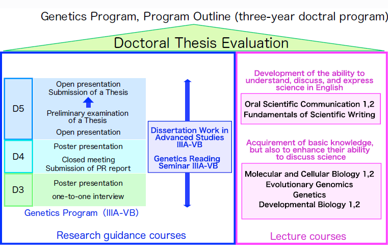 At each course level, grades (A, B, C, D) are determined based on various viewpoints specified on the syllabus. In “Genetics Progress I-V”, in which research abilities of individual students are directly and objectively assessed, the Progress Committee writes a report about each student’s research performances and suggestions by the committee, and submits it to the student and his/her supervisor, in addition to the regular (A, B, C, D) grading. The report is shared by all the faculty at the Genetics Program.