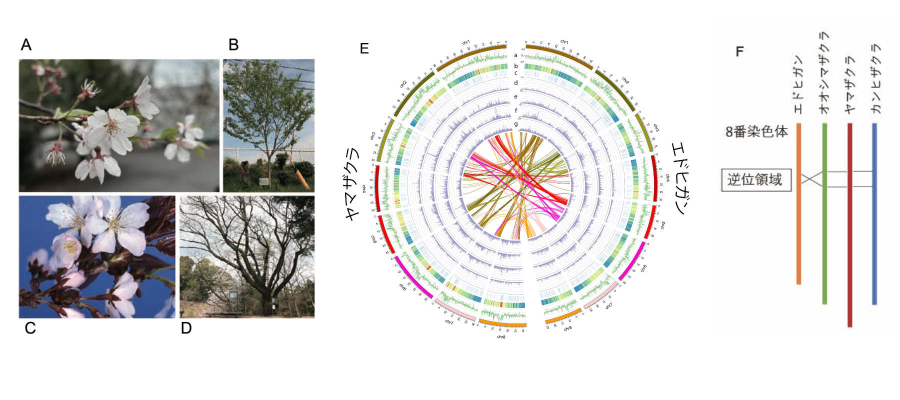 A、B: エドヒガンの花と樹木。C、D:ヤマザクラの花と樹木。E: エドヒガンとヤマザクラの染色体レベルゲノム構造。F: エドヒガンの8番染色体にみられる大型の逆位構造。この逆位は他のオオシマザクラ、ヤマザクラ、カンヒザクラにはみられない。