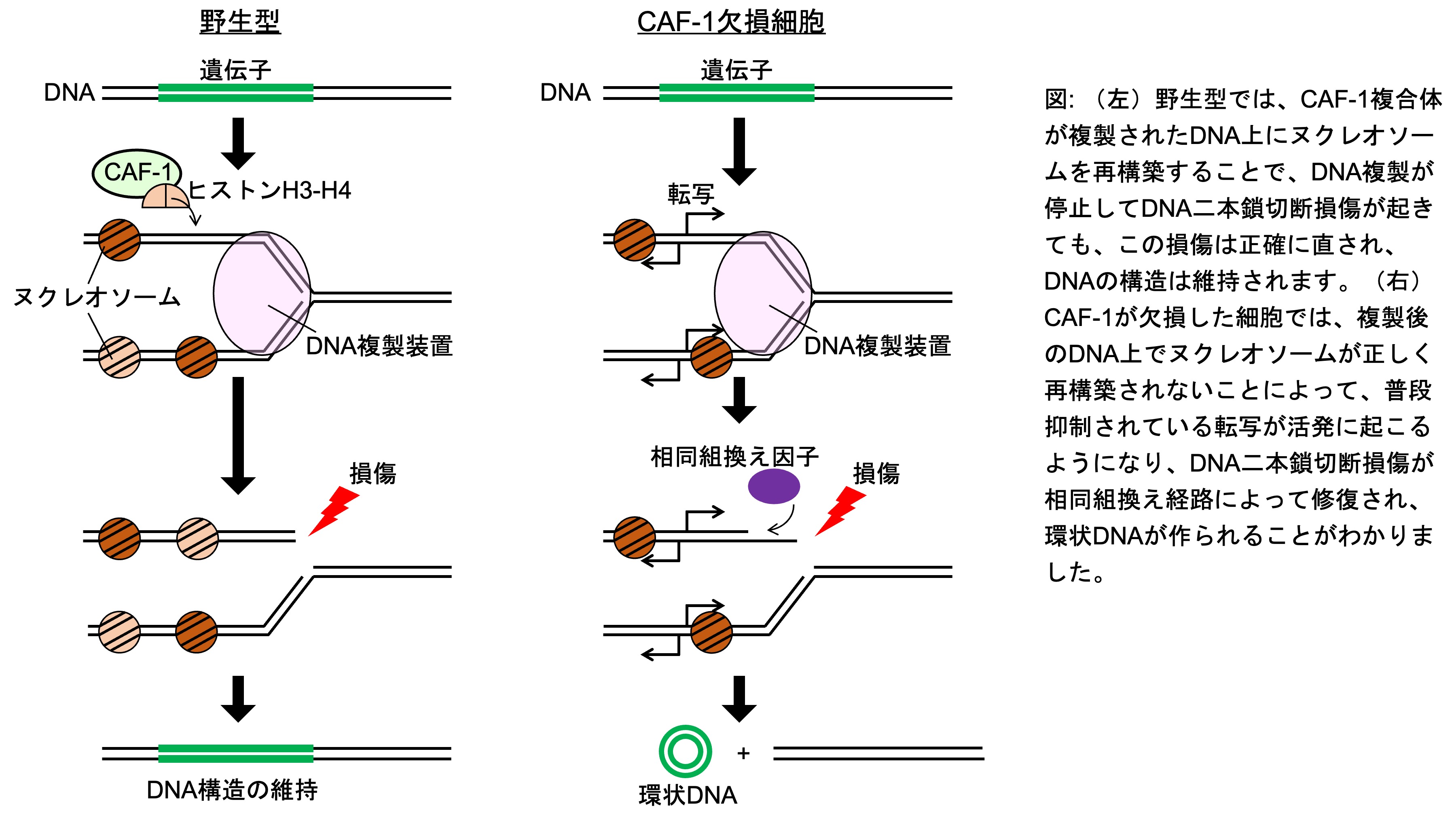 本研究グループは今回、モデル生物の出芽酵母を用いて、DNAの複製後にクロマチンを再構築するCAF-1複合体が失われると、リボソームRNA遺伝子(ribosomal DNA, rDNA)領域から環状rDNAが多数生成されることを確認しました。生成された環状rDNAは、DNAの複製が停止してDNAが切断された際、修復の過程で誤って作られたものと分かりました。CAF-1は複製後のDNAにヌクレオソームを適切な間隔で形成させる役割を持っています。