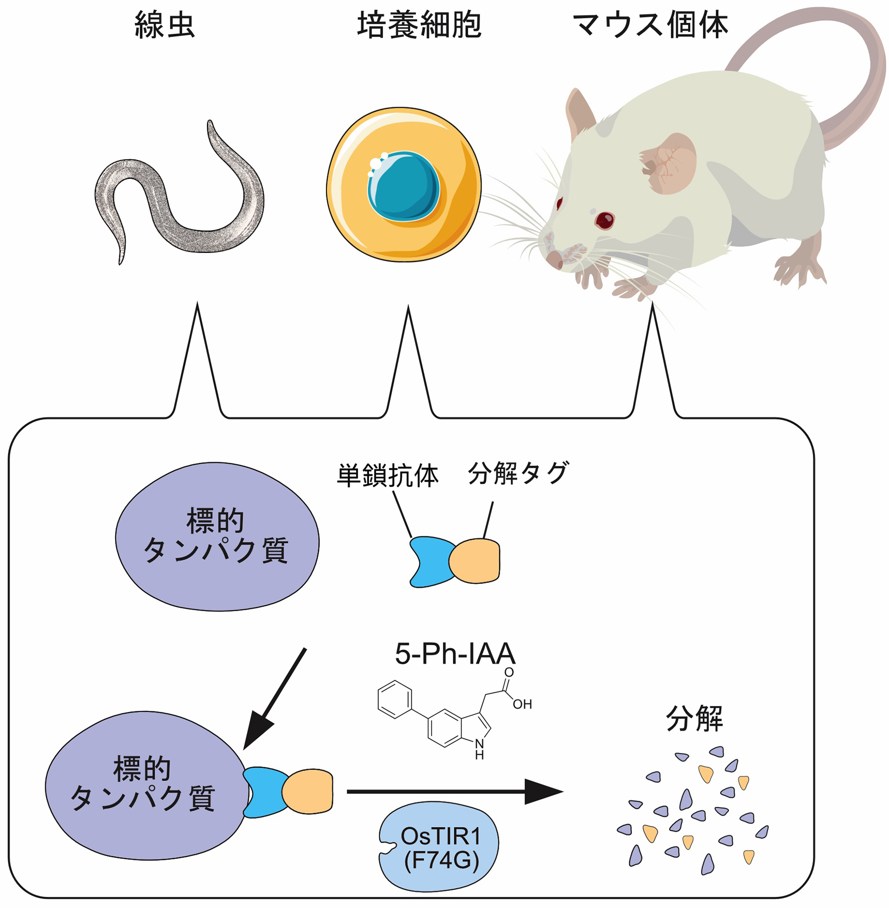 まず実証実験として、GFPを認識する単鎖抗体であるGFPナノボディを用いました。GFPナノボディと分解タグを融合したアダプターと分解に必要なユビキチンリガーゼOsTIR1(F74G)を、様々なGFP融合タンパク質を発現するヒト培養細胞および線虫に導入し、分解誘導リガンド5-Ph-IAAの添加により、これらGFP融合タンパク質がに分解されることを確認しました。
