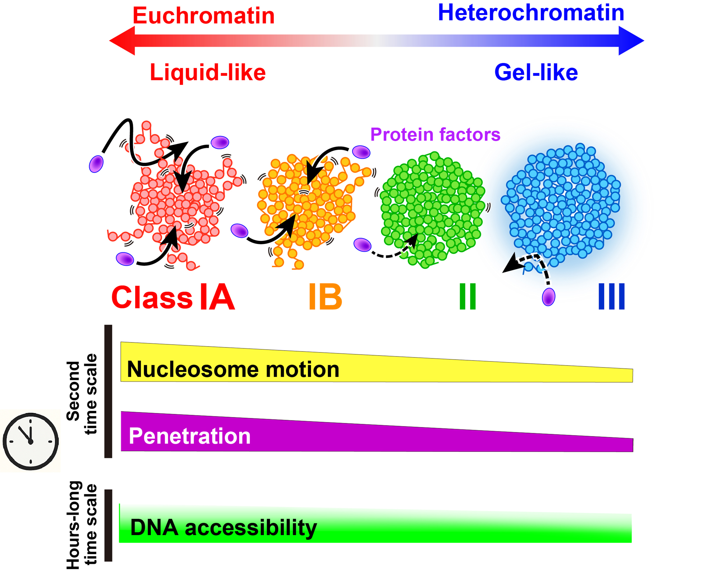 生きた細胞内で、遺伝子の転写が活発に行われるユークロマチン領域(IA, IB)はより「液体様」に、転写の抑制されたヘテロクロマチン(II, III)はより「ゲル様」に振る舞う。この性質は、転写因子(紫)などが短い時間にどれほどクロマチン内部へ「アクセス」しやすいかと直結している。