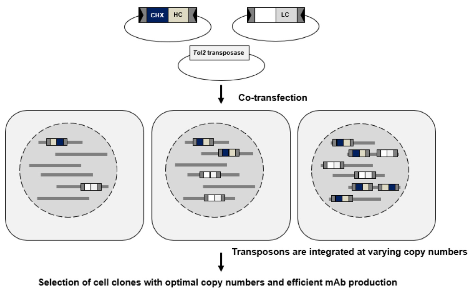 H鎖およびL鎖遺伝子をもつ別々のトランスポゾンベクターを、CHO細胞に同時にトランスフェクションする。薬剤耐性(シクロヘキシミド)遺伝子はL鎖ベクターのみがもつ。トランスフェクションされた細胞内では、H鎖およびL鎖ベクターが、さまざまなコピー数で宿主ゲノムに組み込まれる。最適なH鎖およびL鎖ベクターのコピー数をもつ細胞が、モノクローナル抗体を効率的に生産する細胞株として選択可能である。