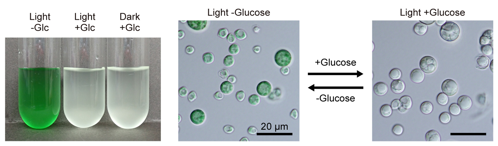 図:異なる条件下で培養したガルデリアの培養液の色(左)と細胞の顕微鏡写真(右)。培地に糖(glucose)を加えると、明暗条件にかかわらず細胞は光合成色素を失い白色化する。逆に糖を除くと細胞は緑色へと変化する。論文の図1A, Bより引用・改変。