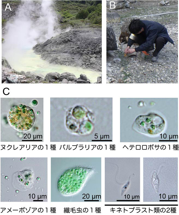 このたび、共生細胞進化研究室の総研大生・砂田さん、辻野さん、博士研究員の山下さん、および宮城島教授らの研究チームは、火山帯に多く見られる高温・強酸性環境の硫酸酸性温泉(40℃以上、pH 2以下)から7種の単細胞真核生物を発見し、単離培養に成功しました。これらの生物は、これまで高温・強酸性環境に生息する真核生物として唯一知られていた単細胞紅藻イデユコゴメ類を主食として生育していることも明らかとなりました。今回見つかった7種の真核生物は、それぞれ真核生物の別々の系統に属しており、それぞれに近縁で中温・中性環境に生息する生物が知られています。つまり、真核生物のさまざまな系統が、酸性および耐熱性の形質をそれぞれ独立に獲得することで、硫酸性温泉という極限環境に進出したことが明らかになりました。