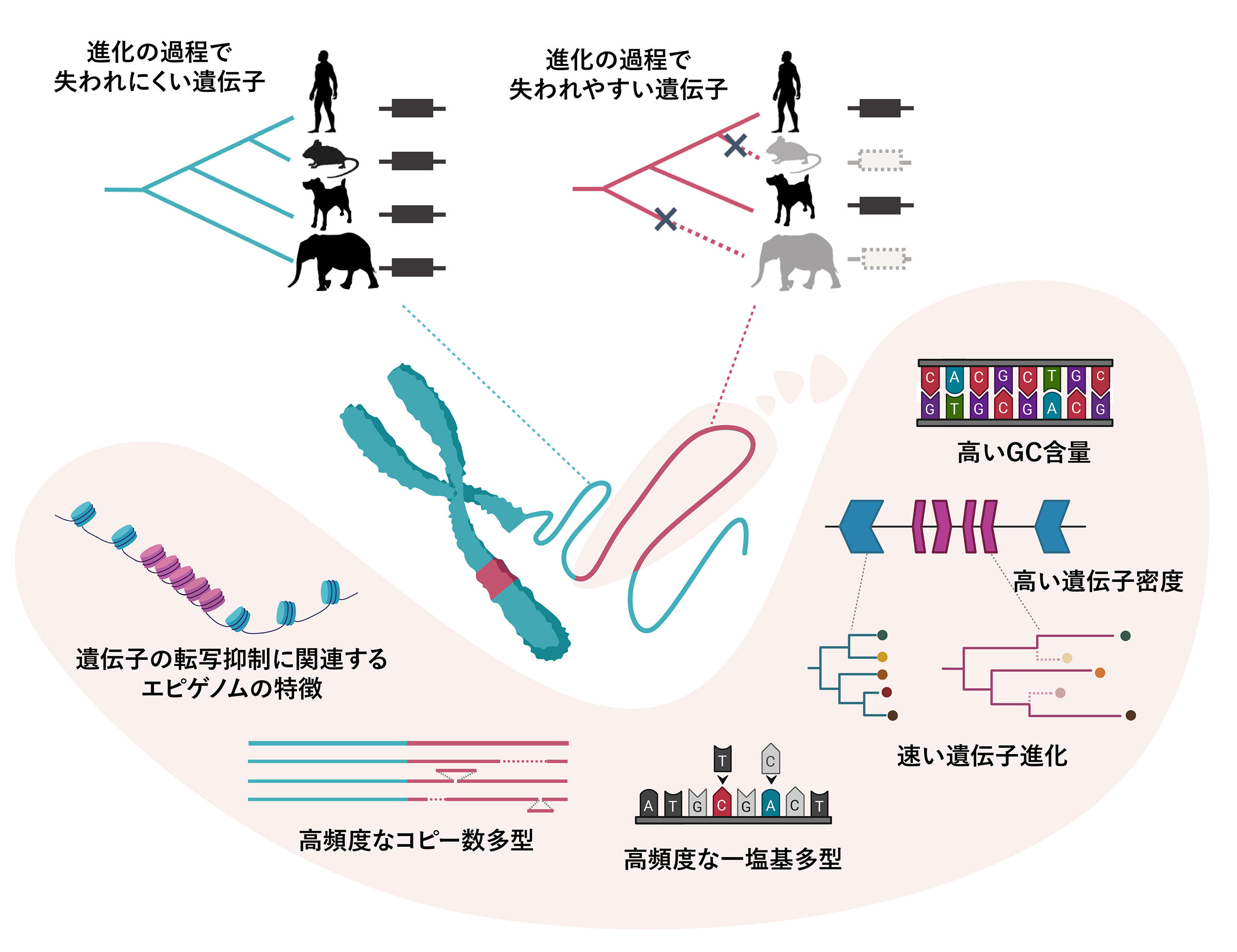 生命の設計図であるゲノムには変異が生じ、その蓄積による設計図の変更が生物進化を駆動してきたことが知られています。変異はゲノム上のすべての領域で等しく生じるわけではなく、ゲノムは変化しやすい領域と保たれやすい領域に分かれることが明らかになってきました。ゲノムには変化しやすい領域があるという知見を踏まえると、進化の過程で失われやすい遺伝子がゲノム内で偏って分布するという観察にも、新たな意味が見えてきます。すなわち、遺伝子が失われる要因には、機能的に必要でなくなることだけではなく変化しやすいゲノム領域に位置することも関わる、という説が導かれるのです。この説を多角的に検証し、ゲノムを変化させる突然変異と保持させるDNA修復の作用がどのようにゲノム内の偏りを生じさせるのかを議論するため、北里大学未来工学部データサイエンス学科の原雄一郎准教授と国立遺伝学研究所ゲノム・進化研究系分子生命史研究室の工樂樹洋教授は、 最近の知見を整理し国際学術雑誌Trends in Geneticsに 総説を出版しました。