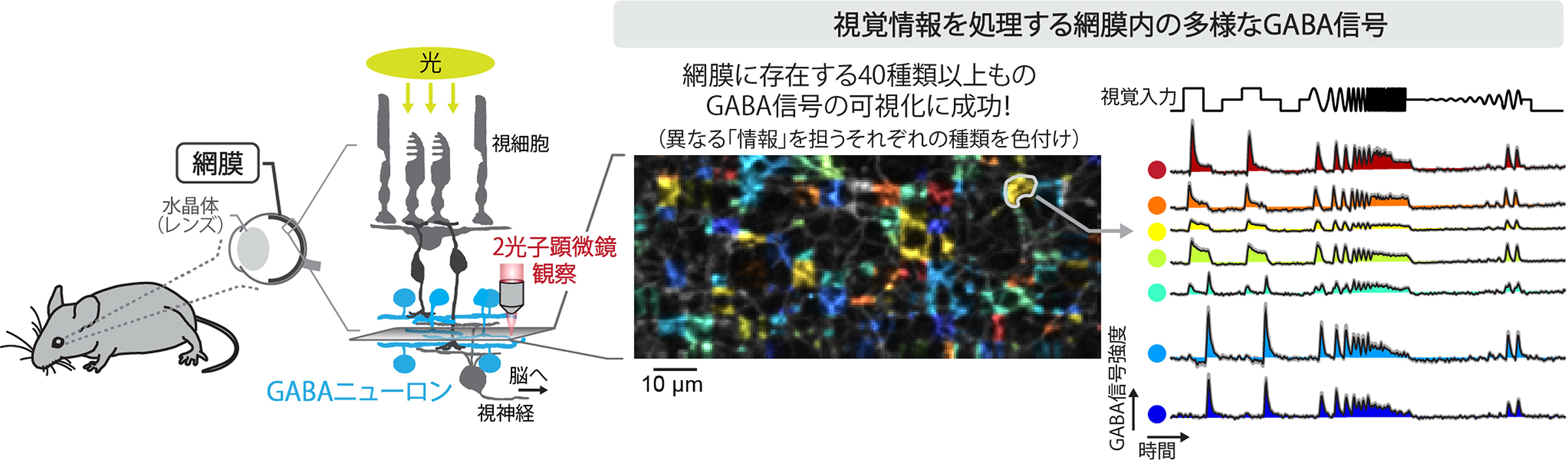本研究は、網膜内でのGABA(ɣ-アミノ酪酸)の多様な役割を世界で初めて明らかにしました。GABAは中枢神経系の主要な抑制性神経伝達物質であり、神経回路の興奮性を調整することで情報処理に重要な働きをするほか、その伝達異常は様々な神経疾患の原因となることが知られています。しかし、GABA信号の多様性については不明でした。