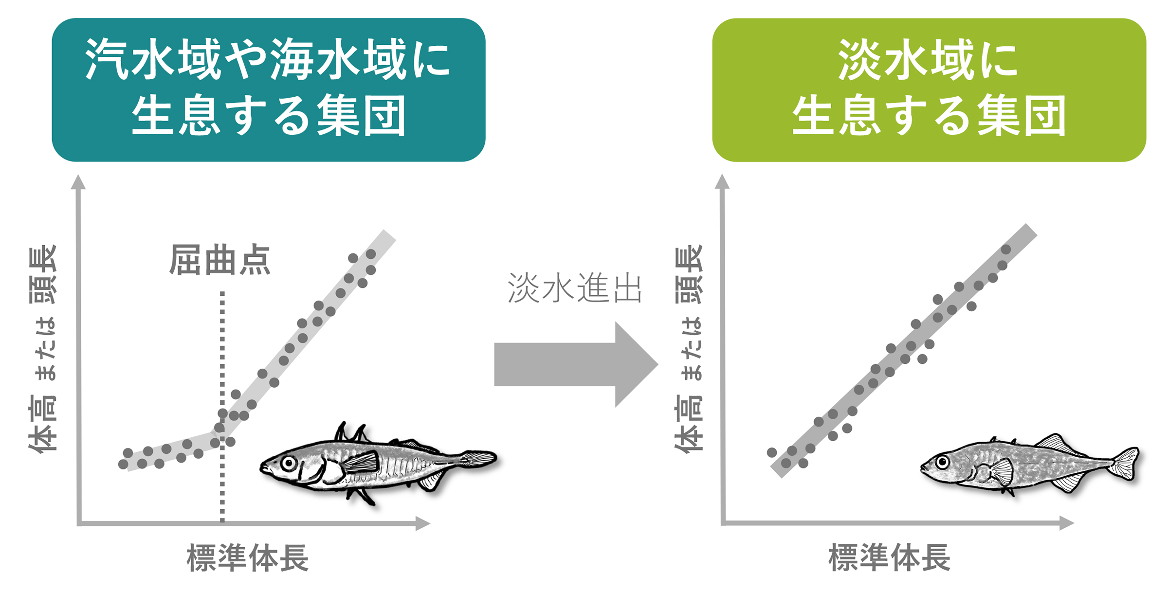 その結果、汽水域から海水域に生息するイトヨ属では、標準体長に対する体高と頭長の成長率が個体発生の過程で変化することがわかりました。その一方で、淡水域のみを利用する集団では、個体発生の過程におけるアロメトリックな変化が少ないことがわかりました。これらの結果は、集団間の発生パターンが生活史と関連している可能性があること、近縁種や種内の集団間であっても、形態アロメトリーにおける発生パターンが異なる可能性があることを示しています。