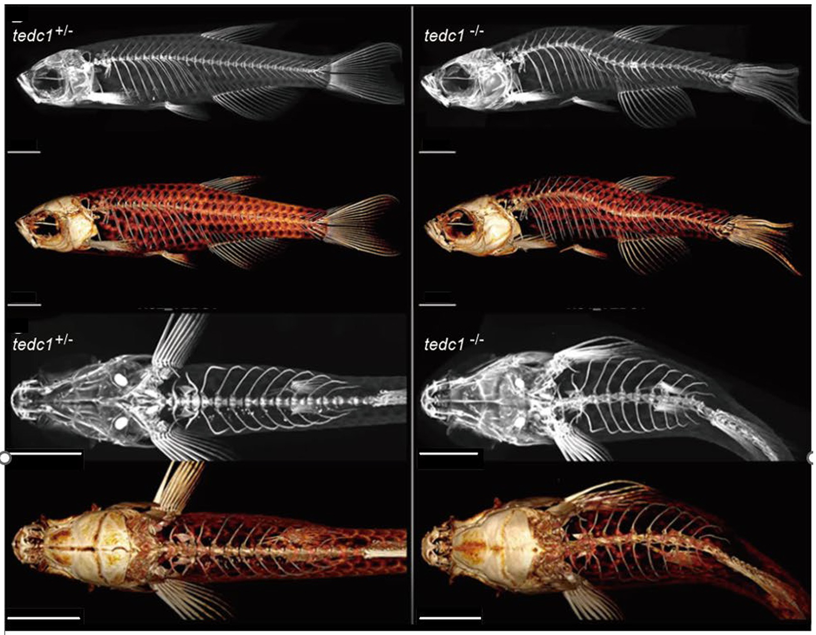 図:tedc1+/− および tedc1−/− ゼブラフィッシュの側面および上面の µCT 画像