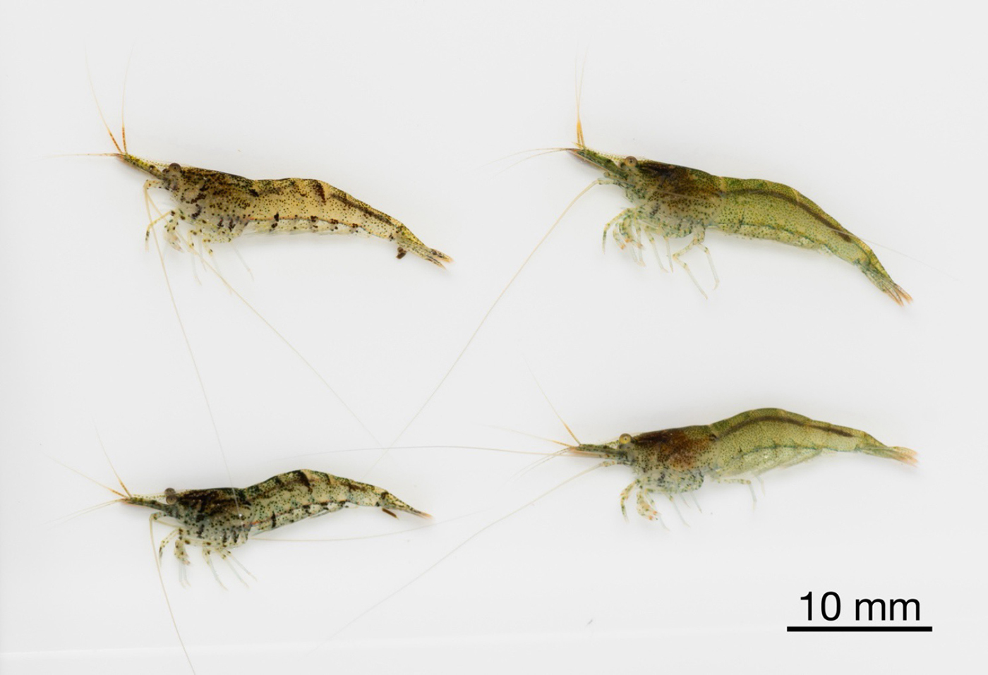 図:在来種ミナミヌマエビNeocaridina denticulata。本研究で調査した水系では、近縁の外来種に追いやられ、ダムの上流側のみで確認された。