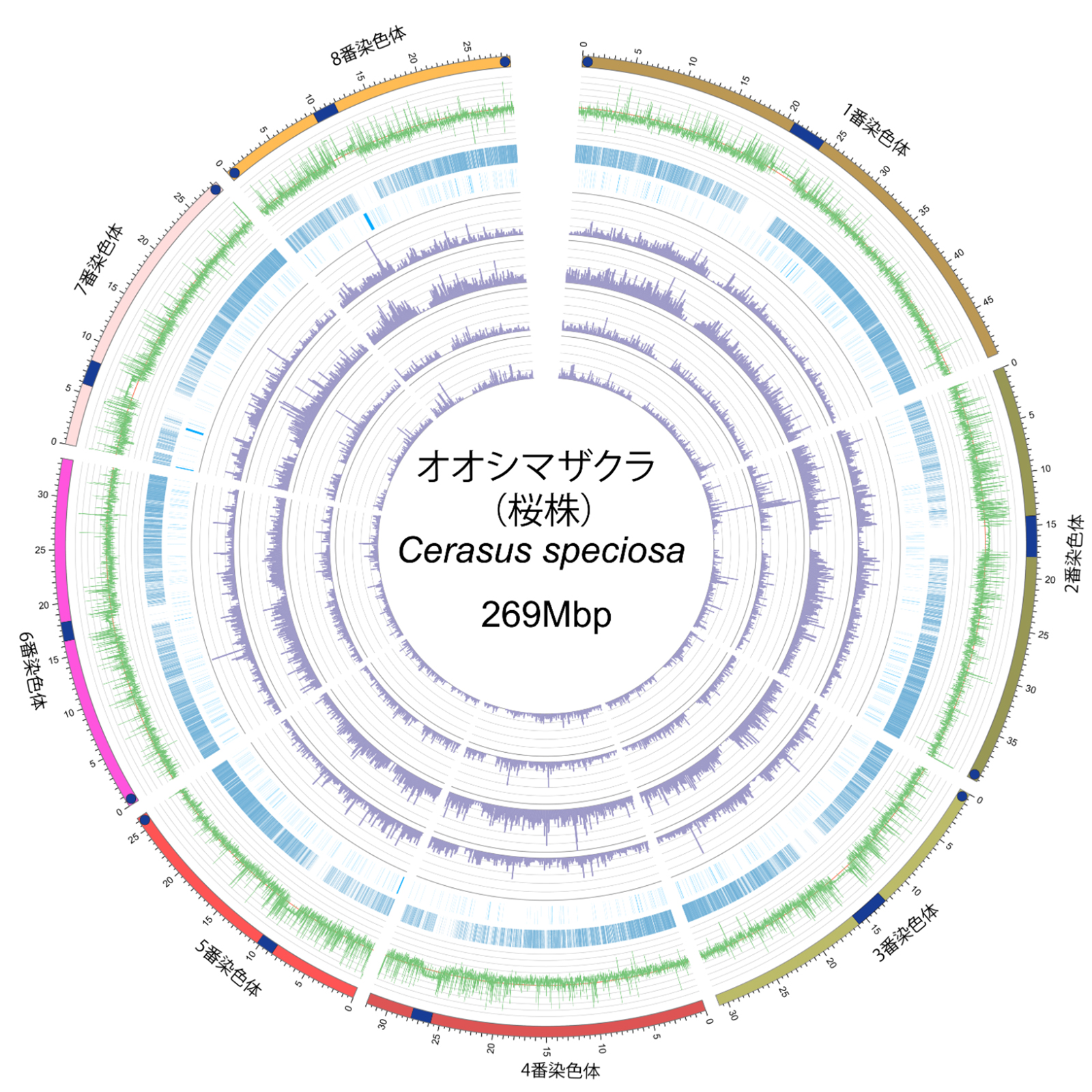 図: オオシマザクラ(桜株)の完全ゲノムの模式図。8本の染色体すべてについて、染色体の構造が明らかになった。外側のサークルは各染色体をあらわし、青いボックスはセントロメア、青い丸はテロメアを示している。多重の線は以下のゲノム配列を示している(外側から2番目:GC塩基の比率、3番目:遺伝子分布、4番目:ノンコーディングRNA遺伝子、5番目:LTR配列、6番目:TIR配列、7番目:LINEおよびSINE配列、8番目:Helitron配列。