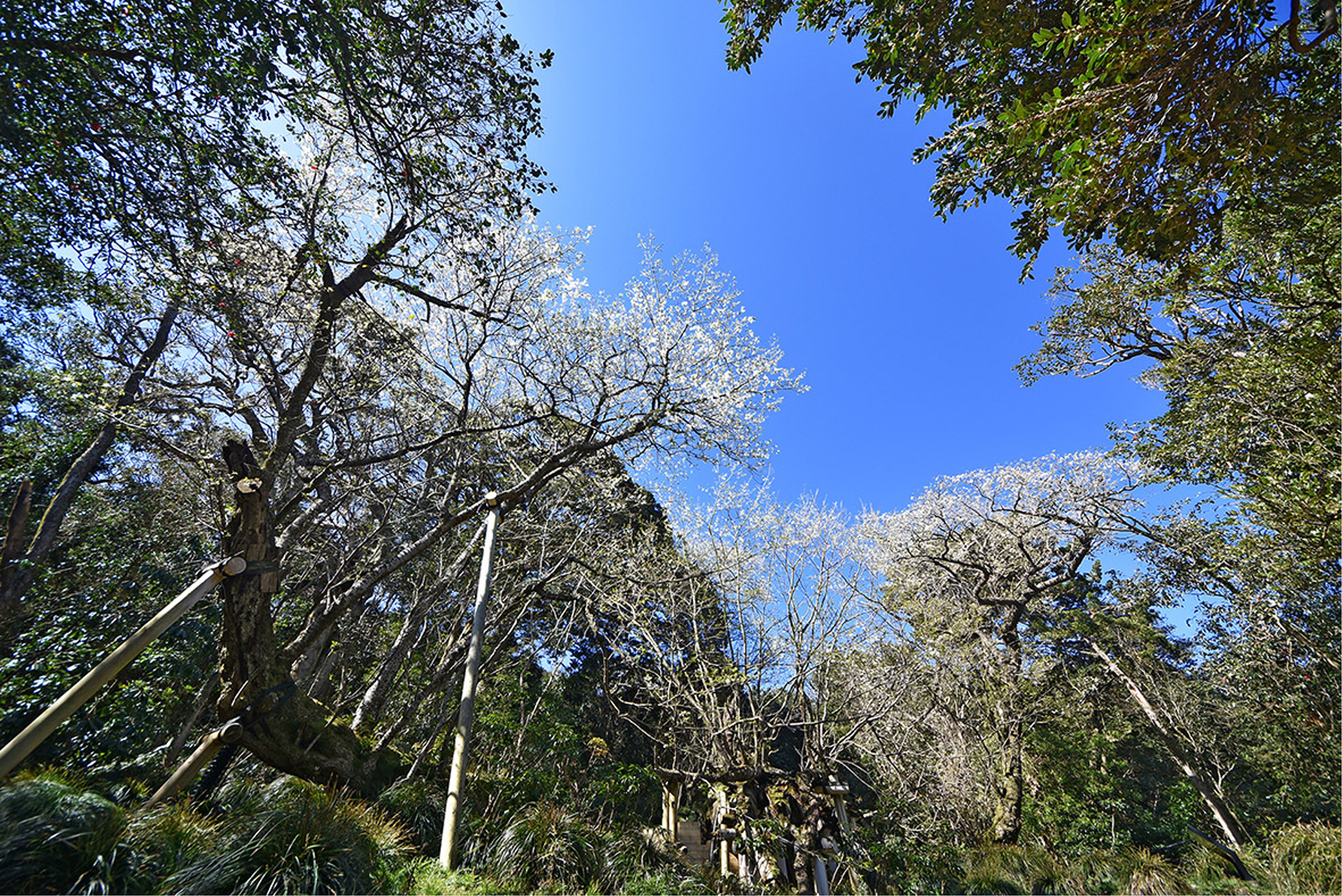 写真: 「大島のサクラ株(さくらっかぶ)」 伊豆大島に自生するオオシマザクラの巨木。樹齢は800年以上と推定され、1952年に国の特別天然記念物に指定される。折れた主幹から大枝が横に張り出している。