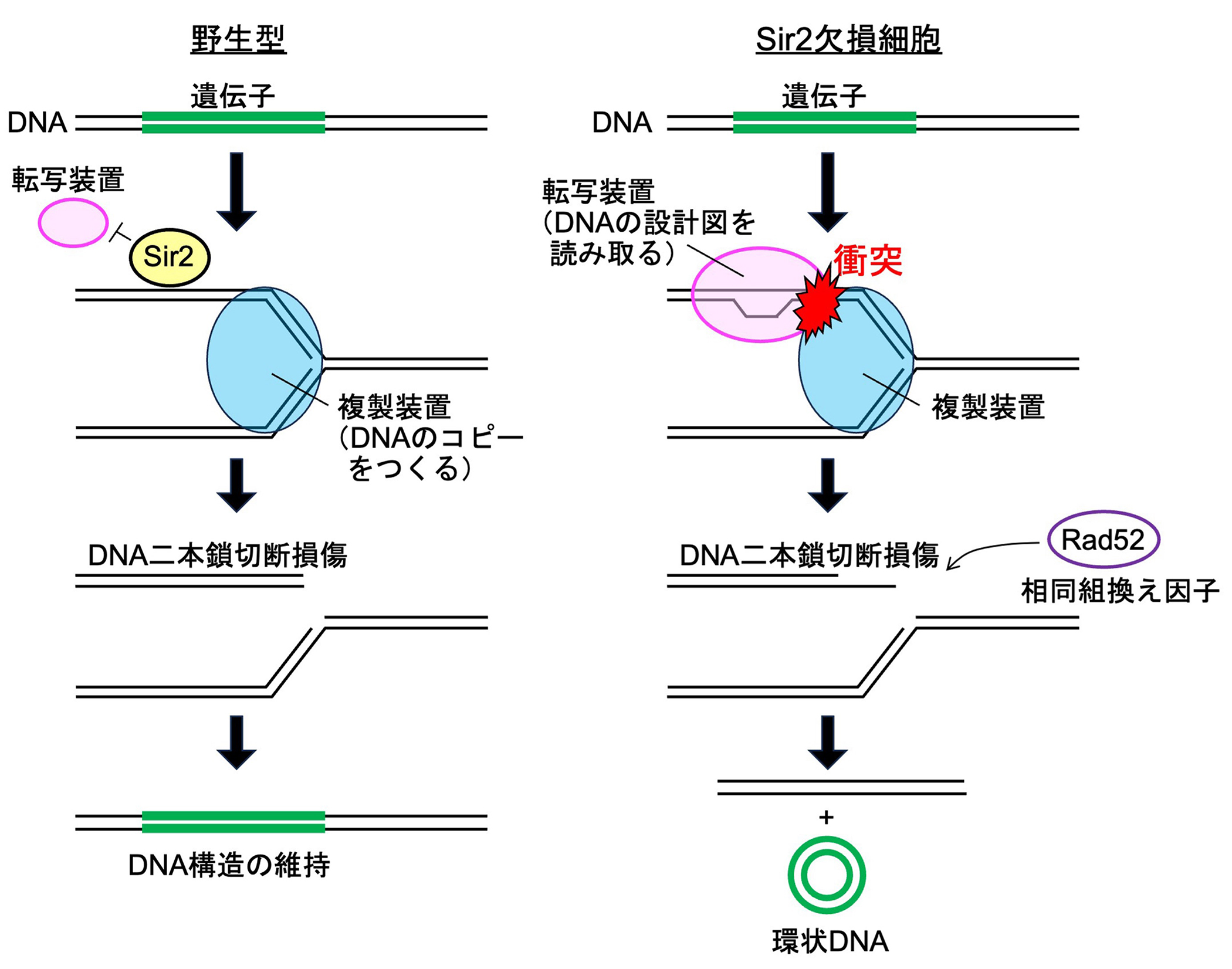 (右)Sir2タンパク質が欠損した細胞では、転写が活発に起こるようになり、転写装置と複製装置が衝突し、DNA二本鎖切断損傷が相同組換え経路によって修復されます。この衝突がリボソームRNA遺伝子などの繰り返し配列で起きると、相同組換えによって環状DNAが作られることがわかりました。