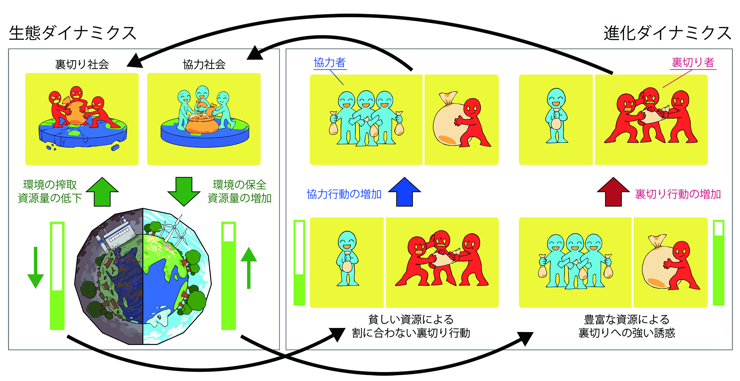 国立遺伝学研究所新分野創造センター理論生態進化研究室の山道真人准教授と長崎大学熱帯医学研究所国際保健学分野の伊東啓准教授は、社会における協力行動が環境中の資源量と相互作用する一般的なゲーム理論の数理モデルを解析し、複雑なフィードバックがもたらす結果を明らかにしました。