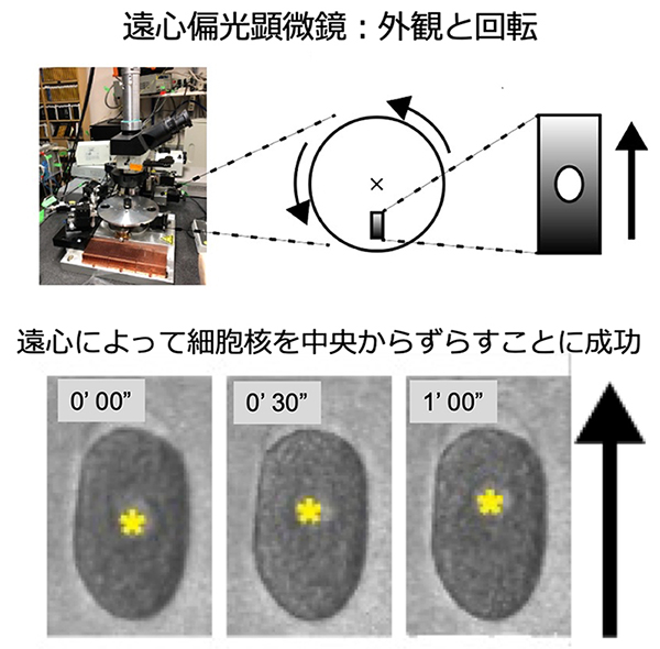 図: 本研究の概要。[上段] 遠心偏光顕微鏡の外観(左)。この顕微鏡ではステージ部分(中)が回転することによって、ステージに設置された細胞(右の楕円)に遠心力が加わる。右の矢印はステージの回転の中心方向を表す。[下段] 実際に観察された線虫胚の様子。アスタリスク(*)が細胞核の位置を表し、当初細胞の中央に位置していた細胞核が、遠心力をかけることにより、ステージの回転の中心方向にずれているのがわかる。