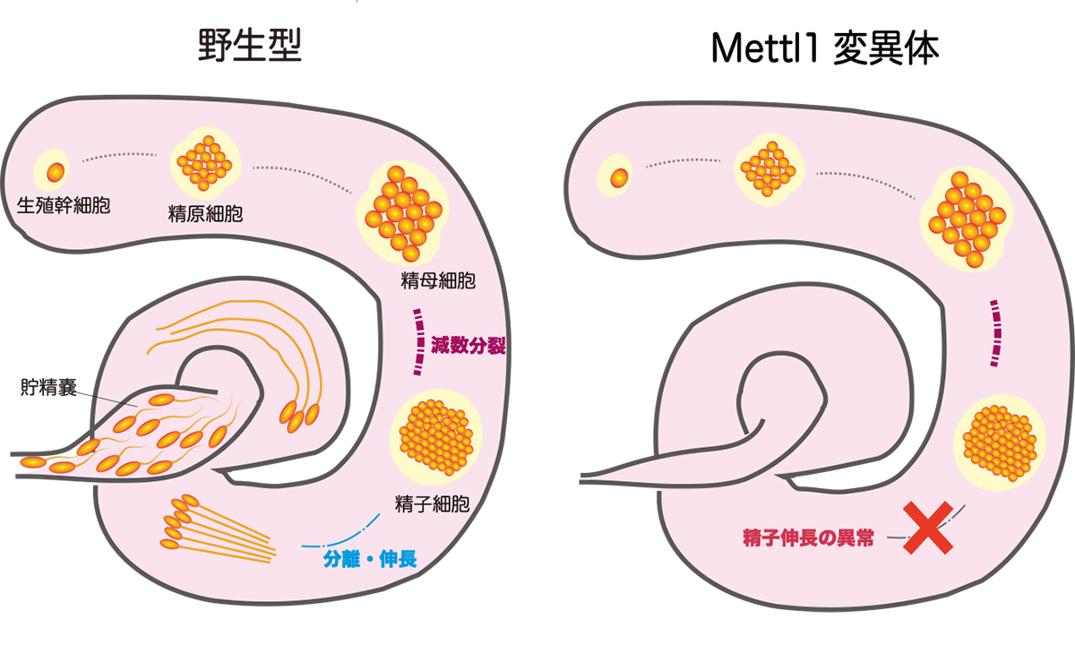 図: キイロショウジョウバエの精巣では生殖幹細胞が4回の有糸分裂を経て精原細胞となったのち、精母細胞が作られる。精母細胞は2回の減数分裂を繰り返して精子細胞となり、分離、伸長の過程を経て成熟した精子となる。作られた精子は貯精嚢に蓄えられている(野生型 左図)。一方でMettl1変異体では、精巣内で精子細胞の存在は確認されたものの、分離、伸長した精子細胞は見られなかった(Mettl1変異体 右図)。これは、精子の分離、伸長に関連するタンパク質が合成されなくなったことによるものであると考えられる。