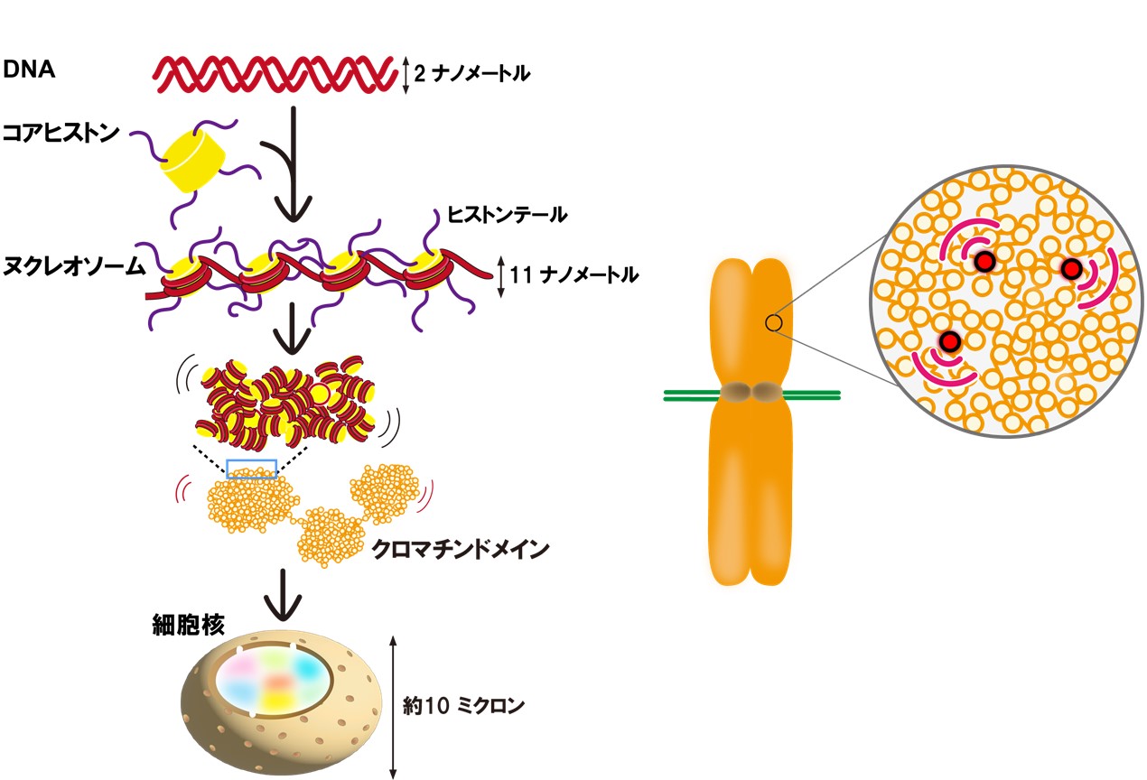 図1: (左)DNAはヒストンに巻かれてヌクレオソームを形成する。ここでは4 個のヌクレオソームが描かれているが、1つの細胞あたり3000万個ものヌクレオソームが存在する。ヌクレオソームは不規則に折り畳まれて塊(クロマチンドメイン)を形成し、細胞の核のなかに収められている。(右)本研究によって、分裂細胞の染色体のなかの単一のヌクレオソーム(赤)を標識する技術が開発され、その振る舞いが明らかになった。