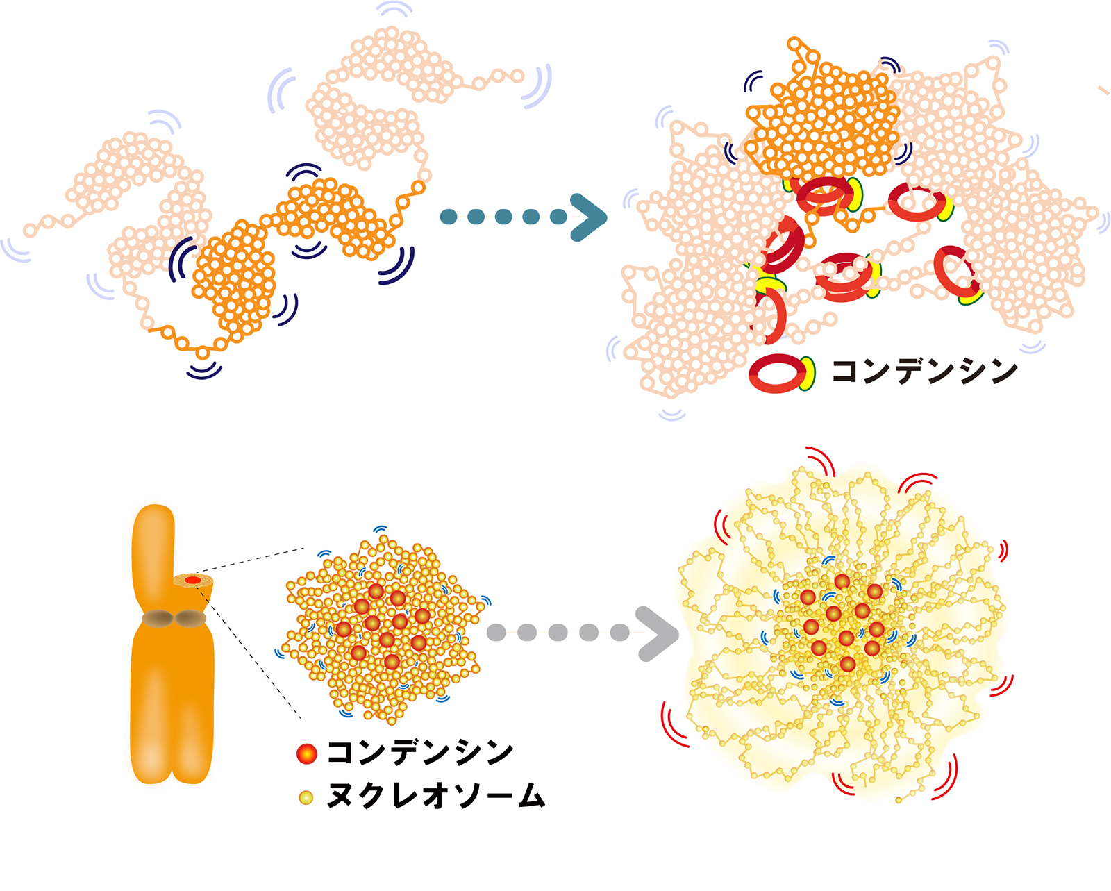 図2: (上段)コンデンシンは、染色体の中心付近でクロマチンドメイン同士を「クリップ」のように結びつけ、ヌクレオソームの揺らぎを抑えている。(下段)ヒストンのテール(尾部)を介したヌクレオソーム間の相互作用を阻害すると染色体が脱凝縮する。ヌクレオソーム間の相互作用も重要な役割を果たしている。