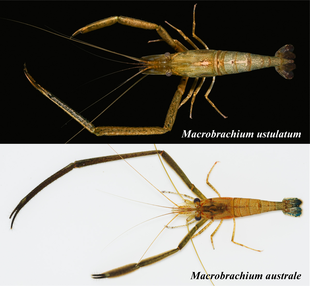 図:ナンヨウテナガエビ(上)近縁種ザラテテナガエビ(下)。著者ら撮影。