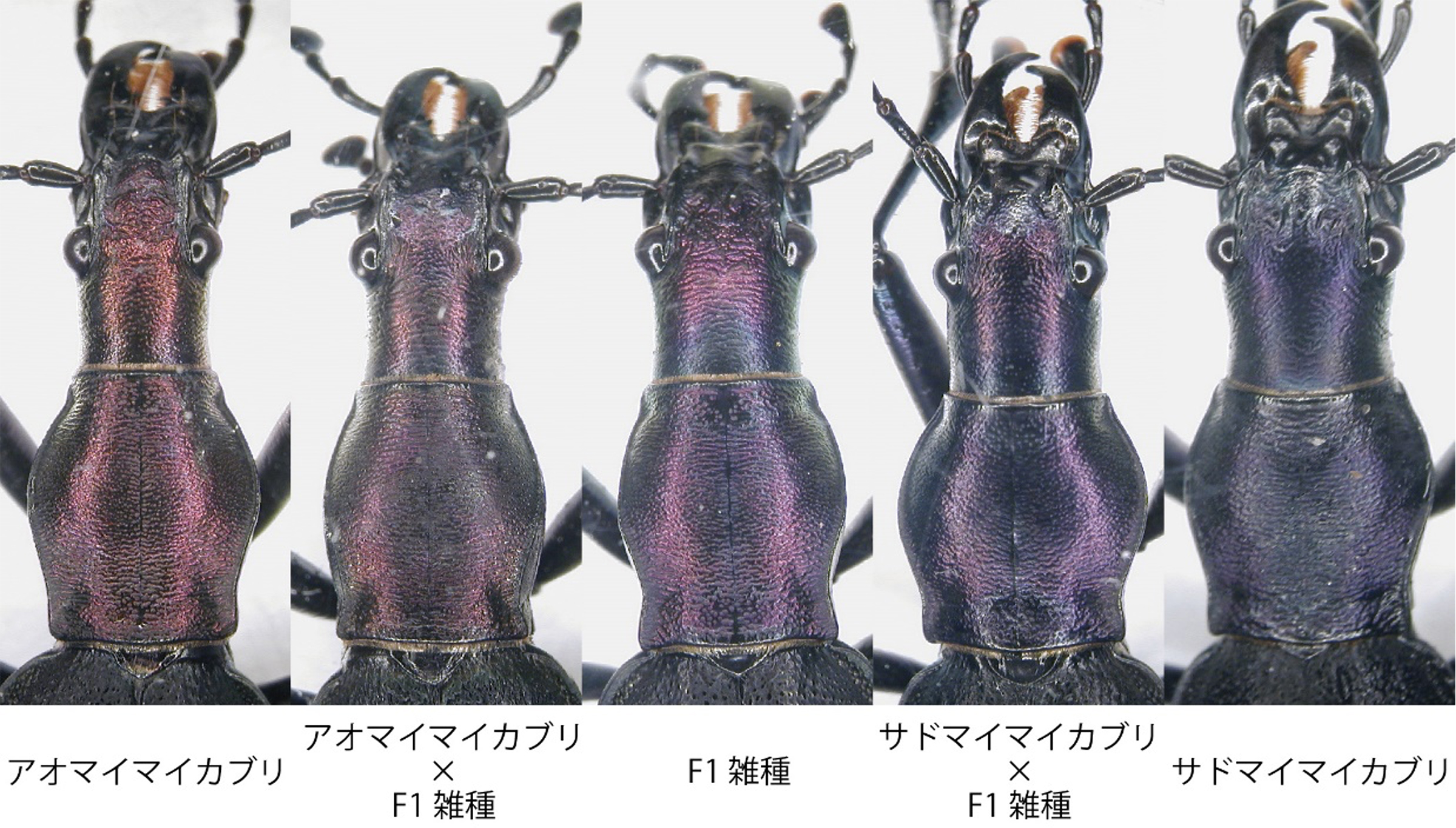 図: 狭頭型アオマイマイカブリと巨頭型サドマイマイカブリと雑種個体