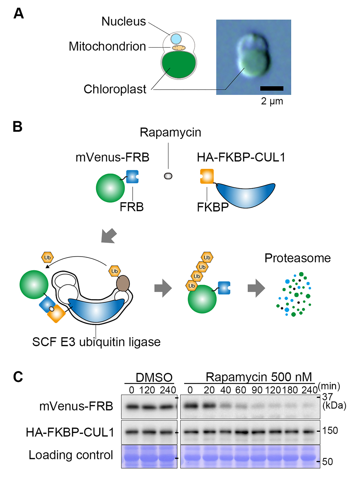 そこで我々は、イデユコゴメ類のC. merolae(図A)において、新たに、ラパマイシン誘導タンパク質ノックダウン法を開発しました。本手法は、化学物質ラパマイシンが、FRBタグ(ペプチド)とFKBPタンパク質を結合させる性質を利用しています(図B)。標的タンパク質にFRBを、ユビキチンリガーゼのサブユニット(CUL1)にFKBPを融合した細胞を用意し、これにラパマイシンを与えると、標的タンパク質とユビキチンリガーゼ複合体が結合し、標的タンパク質のユビキチン化とその後の分解が起こります(図B)。本手法を用いると、例えば試験用の標的タンパク質(蛍光タンパク質mVenus-FRB)は、ラパマイシン添加後、2時間以内にほとんど分解されます(図C)。また、論文中では、内在の必須遺伝子であるDRP5B(葉緑体分裂タンパク質)や、核内の細胞周期制御因子E2Fを迅速に分解できることを示しています。