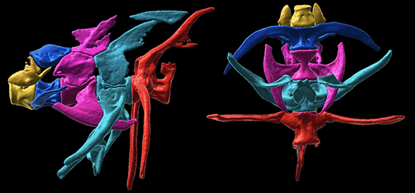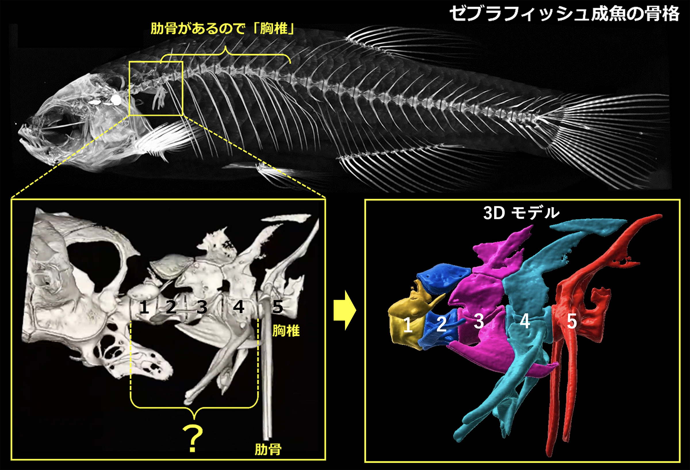 脊椎動物のからだに共通してみられる背骨は、椎骨が連なった繰り返し構造をしています。ヒトの各椎骨は前方から、首の骨である「頸椎」、肋骨と接続する「胸椎」、そして「腰椎」、「仙椎」、「尾椎」と分かれています。魚にも肋骨があり、魚も「胸椎」をもっていることがわかります。では、魚に首の骨、「頸椎」はあるのでしょうか。この問いは、脊椎動物の「背骨の進化」を紐解くうえで非常に重要です。
