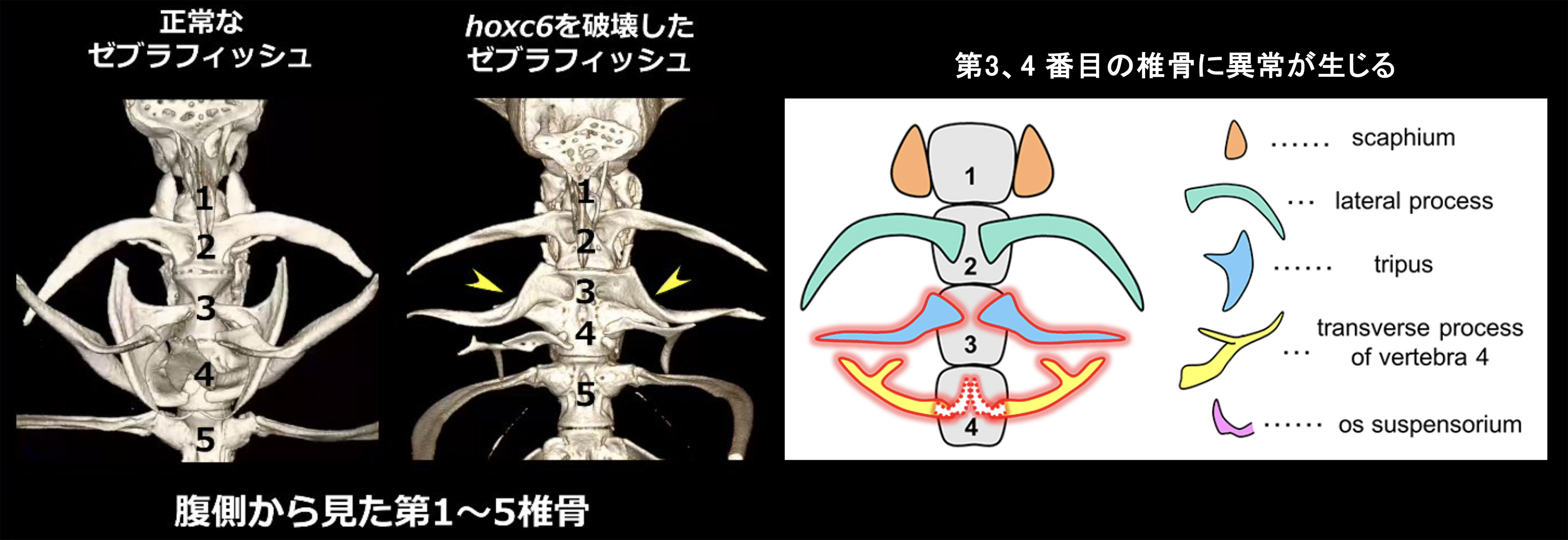 埼玉大学大学院・理工学研究科 生体制御学プログラム 川村哲規 准教授と国立遺伝学研究所 前野哲輝 技術専門職員は、宇都宮大学・バイオサイエンス教育研究センター 松田 勝 教授、岩波礼将 特任准教授らと共同で、椎骨の個性をもたらすHox(ホックス)遺伝子を壊したゼブラフィッシュやメダカを多種類作製し、どの位置の椎骨に異常が生じ、椎骨の個性を決めているかを調べました。その結果、魚の2番目の椎骨は「胸椎」と考えられ、魚の最前部の椎骨のみが「頸椎」と類似した性質をもつ可能性を示しました。本成果は、発生生物学の専門誌 『Development』に6月28日付でオンラインにて掲載されました。