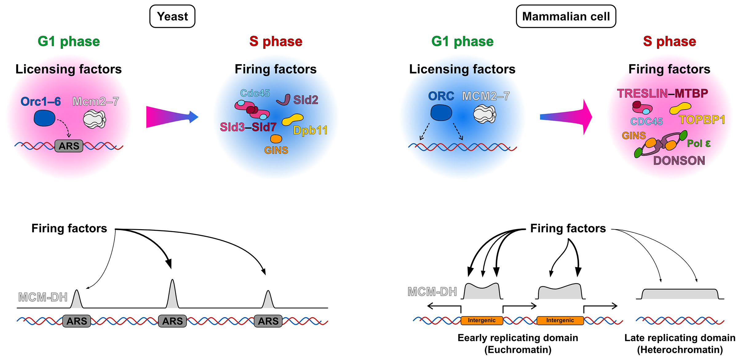 図:出芽酵母と哺乳動物細胞における複製開始領域選択メカニズムの違い。酵母においてはARS(autonomously replicating sequence)というコンセンサス配列を持つ部位にライセンシング複製因子が集積しDNA複製が開始する。一方、哺乳動物細胞ではライセンシング因子はゲノム上に広く分布しており、その後に集積する発火因子が制御を受けて特定の場所に集積することが、複製開始領域を作るのに重要ではないかと考えられる。