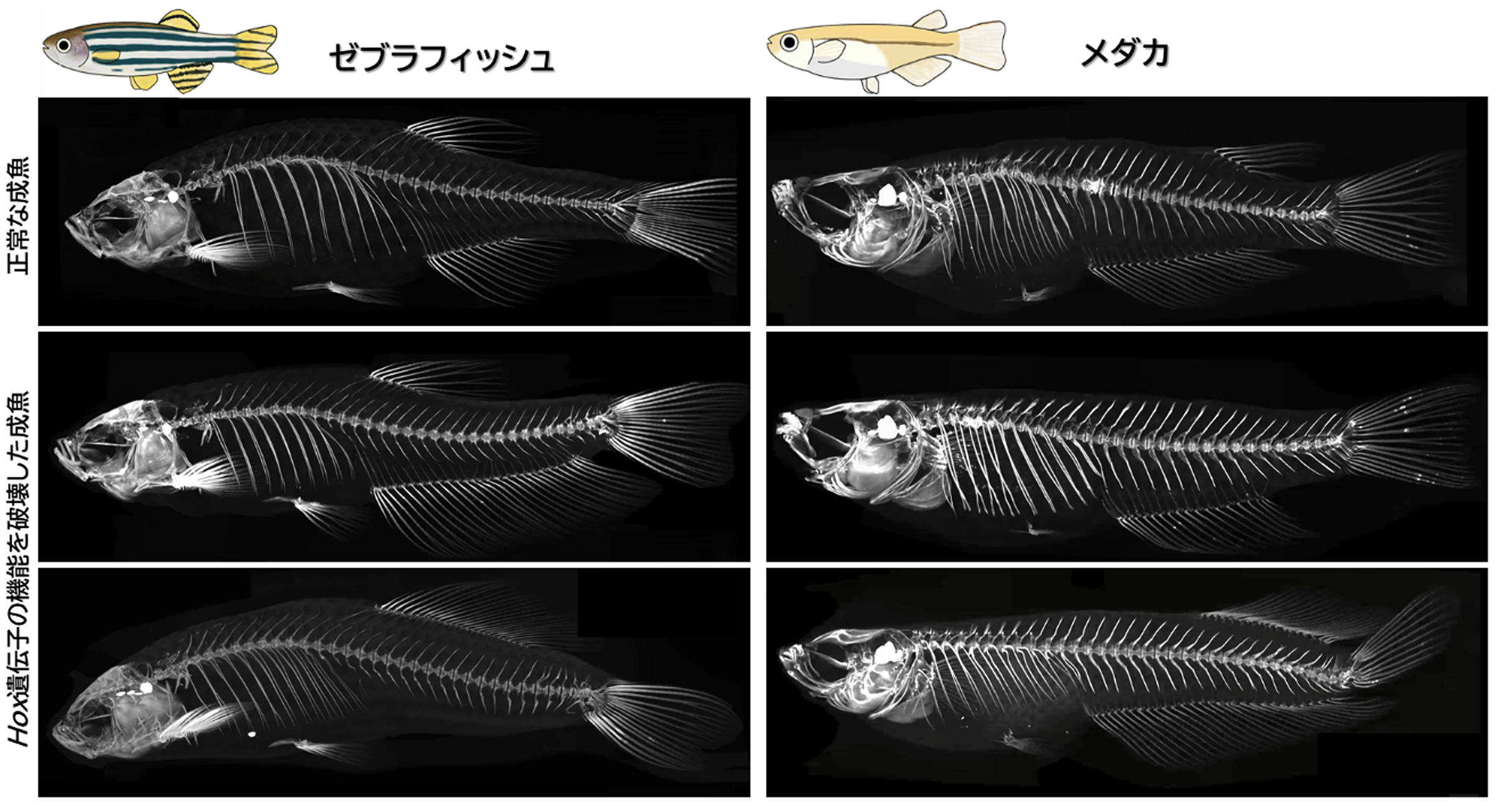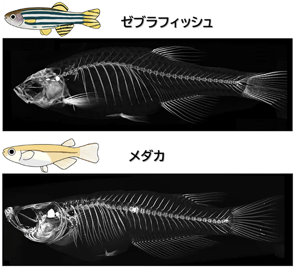 埼玉大学大学院・理工学研究科・生体制御学プログラム 川村哲規 准教授と安達うらら 大学院生(令和5年度博士前期課程修了)を中心とするグループは、宇都宮大学・バイオサイエンス教育研究センター 松田 勝 教授、岩波礼将 特任准教授、情報・システム研究機構 国立遺伝学研究所 川上浩一 教授、前野哲輝 技術専門職員、埼玉大学・理工学研究科 古舘宏之 助教らと共同で、魚のヒレの形成される位置がHox(ホックス)遺伝子によって制御されていることを初めて明らかにしました。この成果により、Hox遺伝子の働く場所が魚の種類によって異なることで、バラエティーに富んだヒレが生み出されることが示唆されました。つまり、多様なヒレの位置やヒレの幅の違いは、Hox遺伝子からなるシステムを一部、変化させることで生じていることが分かりました。さらに、本研究から、進化の過程で、魚のヒレの形成位置が変化してきた仕組みについて、新たなモデルが提唱されました。