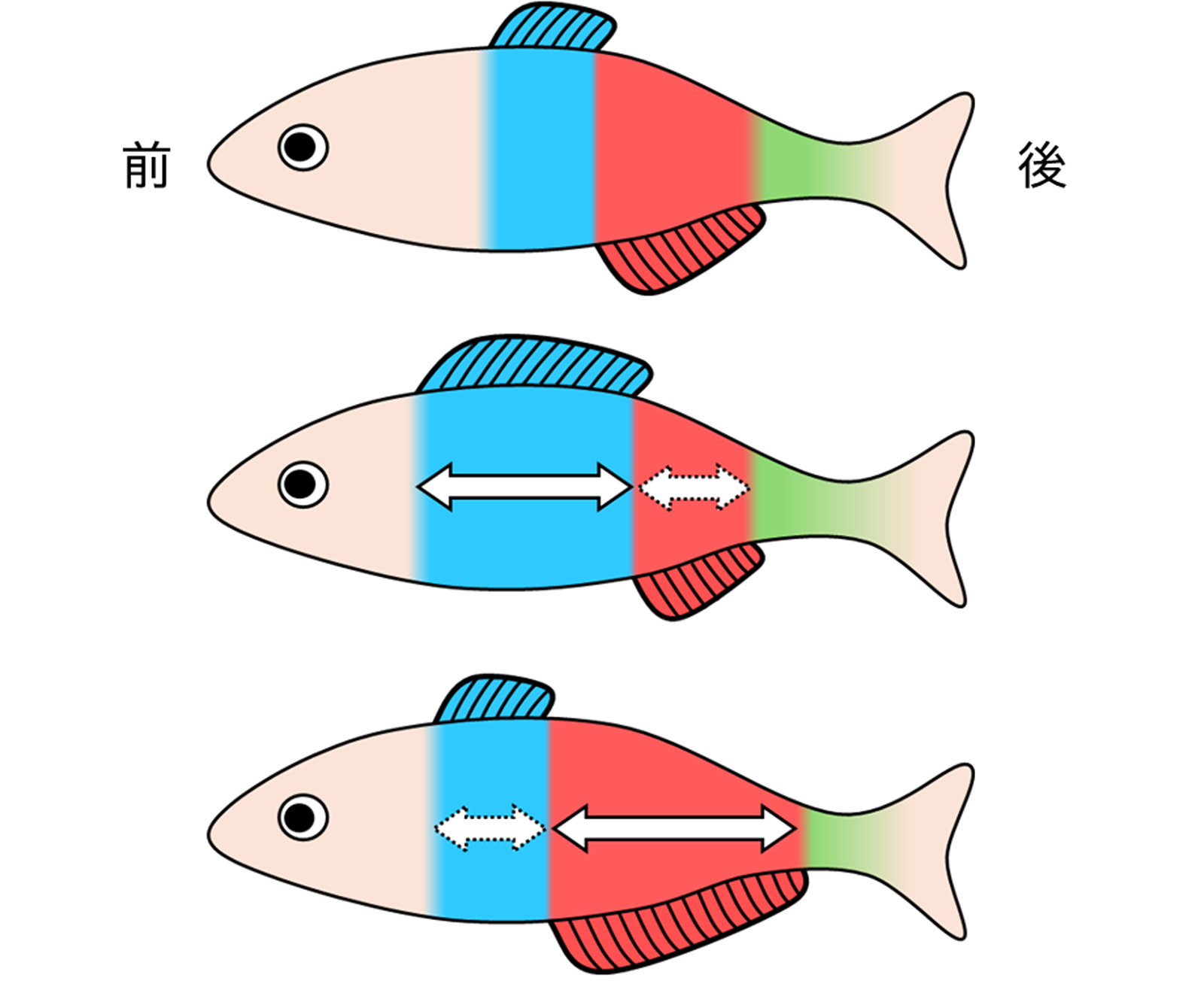 色で示すように、背ビレや臀ビレが形成される魚のからだの領域が、複数のHox遺伝子によって区分されている(図:上)。Hox遺伝子の働く場所は、前後にシフトすることが知られている。Hox遺伝子の働く場所が、パラメーターのように変化することで、形成位置や長さが大きく異なったヒレが生じることが示された。(図:中央、下)