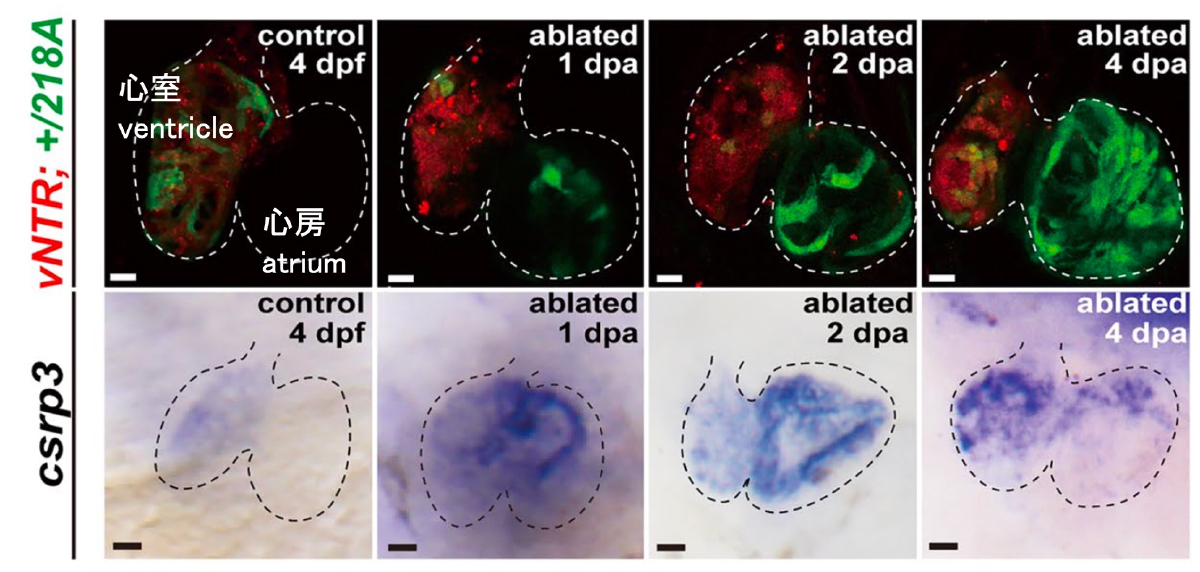 図:心室心筋細胞を除去した心臓の心房におけるcsrp3遺伝子の発現誘導
