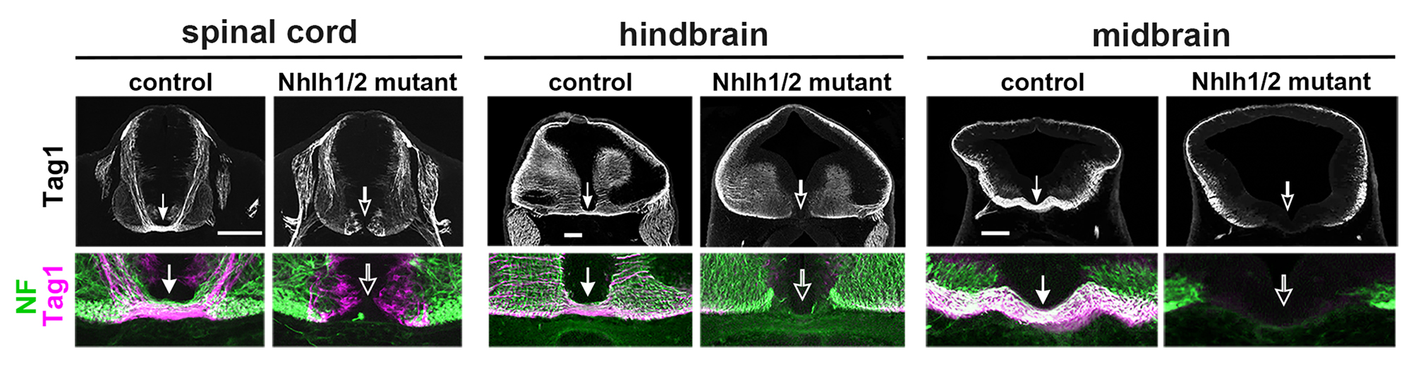 図1:Nhlh1/2二重変異マウスでは、神経管の正中線を横切る軸索が完全に欠如している。
