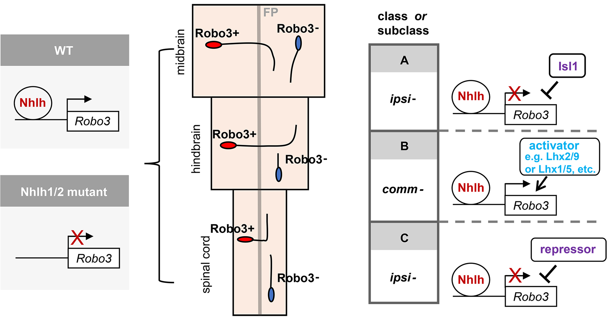 図2:転写因子Nhlh1/2はガイダンス受容体Robo3の調節領域に結合し、その転写を活性化する。Nhlh1/2を欠損させるとRobo3の発現が大きく減少し、その結果、神経管の正中線を横切る軸索が形成されなくなる。Nhlh1/2の活性は、Isl1やLhxのような領域特異的な転写因子によって制御される。