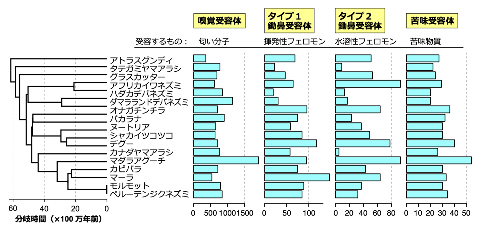 宮崎大学農学部獣医学科新村芳人教授、国立遺伝学研究所小出剛准教授・豊田敦特任教授、ふじのくに地球環境史ミュージアム岸田拓士准教授(研究当時。現在は日本大学生物資源科学部教授)、京都大学野生動物研究センター村山美穂教授らは、ガーナ大学との共同研究として、嗅覚・フェロモン・味覚の受容体遺伝子は、進化の過程で、同調的に増えたり減ったりしていることを示しました。