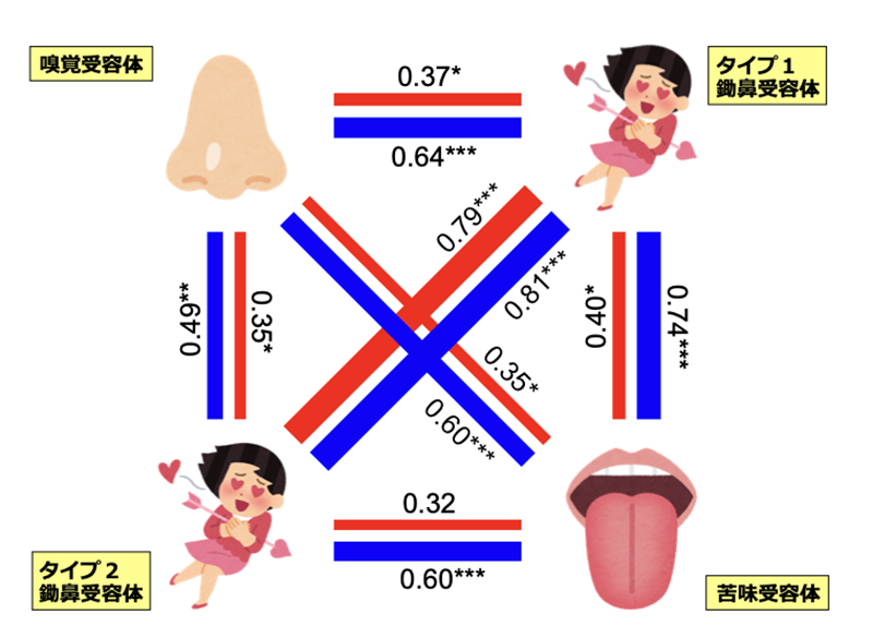 霊長類は、高度な視覚をもつ反面、嗅覚はあまり発達していません。また、ハクジラ類(イルカ)では、嗅覚や味覚は退化していますが、音波で外界を探索する反響定位の能力を進化させてきました。限られたエネルギーを異なる感覚系に振り分けなければならないため、「感覚のトレード・オフ」が起きると考えられています。しかしながら、異なる化学感覚―嗅覚・フェロモン・味覚―間でトレード・オフが起きるかどうかは、よくわかっていませんでした。ヤマアラシ亜目の進化系統樹(図1)の各枝において、遺伝子の重複・欠失がそれぞれ何回起きたかを分子進化学的な手法によって推定しました。解析の結果、ヤマアラシ亜目の系統樹の各枝で起きた重複(または欠失)数が、4種の化学感覚受容体遺伝子間で正の相関があることが分かりました(図2)。つまり、進化の過程において、ある生物の系統で、嗅覚受容体遺伝子の数が増える(減る)と、同時にフェロモンや味覚の受容体遺伝子の数も増える(減る)ということです。このことから、化学感覚間では感覚のトレード・オフは起きず、化学感覚受容体遺伝子は同調して増えたり減ったりしていることが示されました。