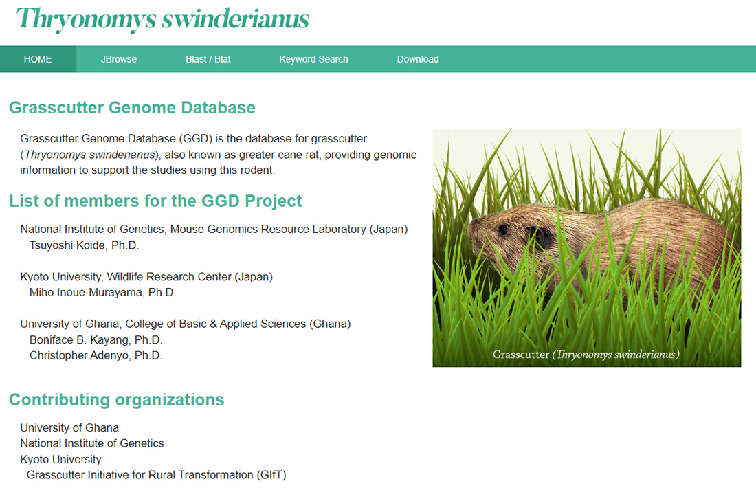 また、本研究ではグラスカッターのゲノムを高精度で解読し、新たにゲノム情報のウェブブラウザを作成しました(https://grasscutter.nig.ac.jp/)(図3)。グラスカッターは西アフリカ地域で食用に好まれている大型齧歯類です。現在、ガーナ大学においてグラスカッターの家畜化プロジェクトを進めており、本成果を家畜化の推進に活用されることが期待されます。