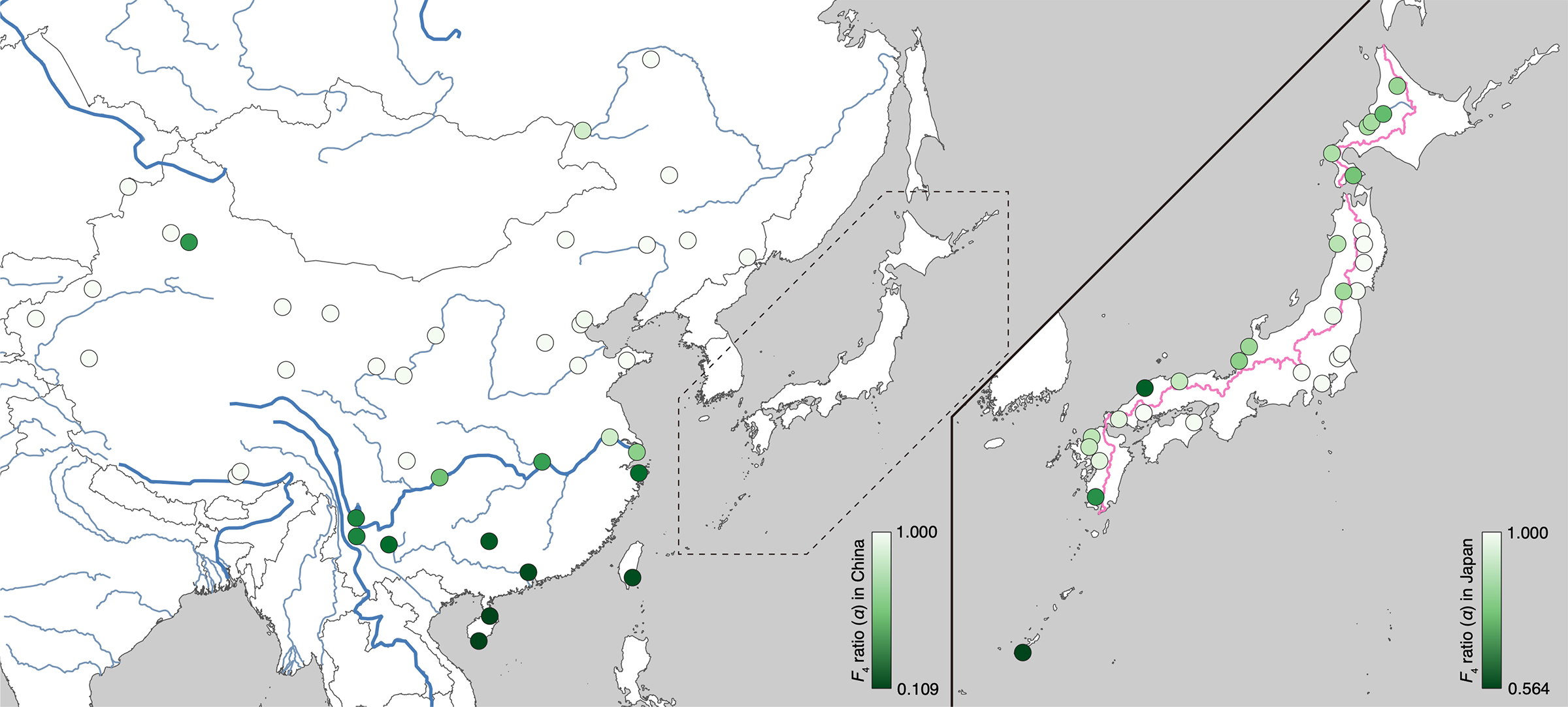図: 全ゲノム解析を用いて可視化した、東アジア地域のハツカネズミの遺伝的多様性。緑色が南方由来であるcastaneus亜種の遺伝的成分の強さを表している。