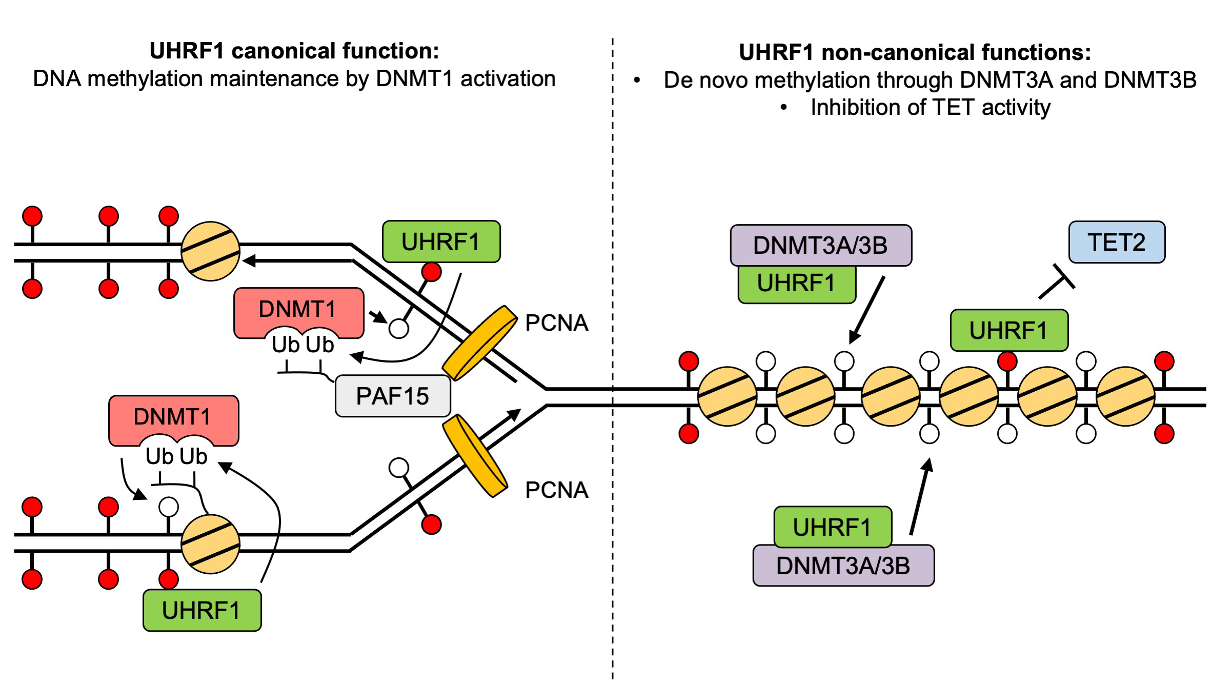 細胞が増殖する際には遺伝情報物質であるゲノムDNAが複製されます。その際、DNAだけではなく、細胞の生存に必須なDNAの修飾情報であるDNAメチル化も親細胞から娘細胞に維持されていきます。このDNAメチル化を維持するには、DNAメチル化酵素であるDNMT1とその活性化因子であるUHRF1が重要であることが知られていました。しかし、UHRF1自体にはDNAメチル化酵素としての機能はなく、UHRF1はあくまでDNAメチル化酵素であるDNMT1の機能を補助する役割であると認識されていました。一方で、UHRF1はDNMT1と異なり癌原遺伝子としても認識されており、多くの癌細胞において過剰発現をしていることが知られていたため、DNMT1の制御以外の役割があることが示唆されていました。