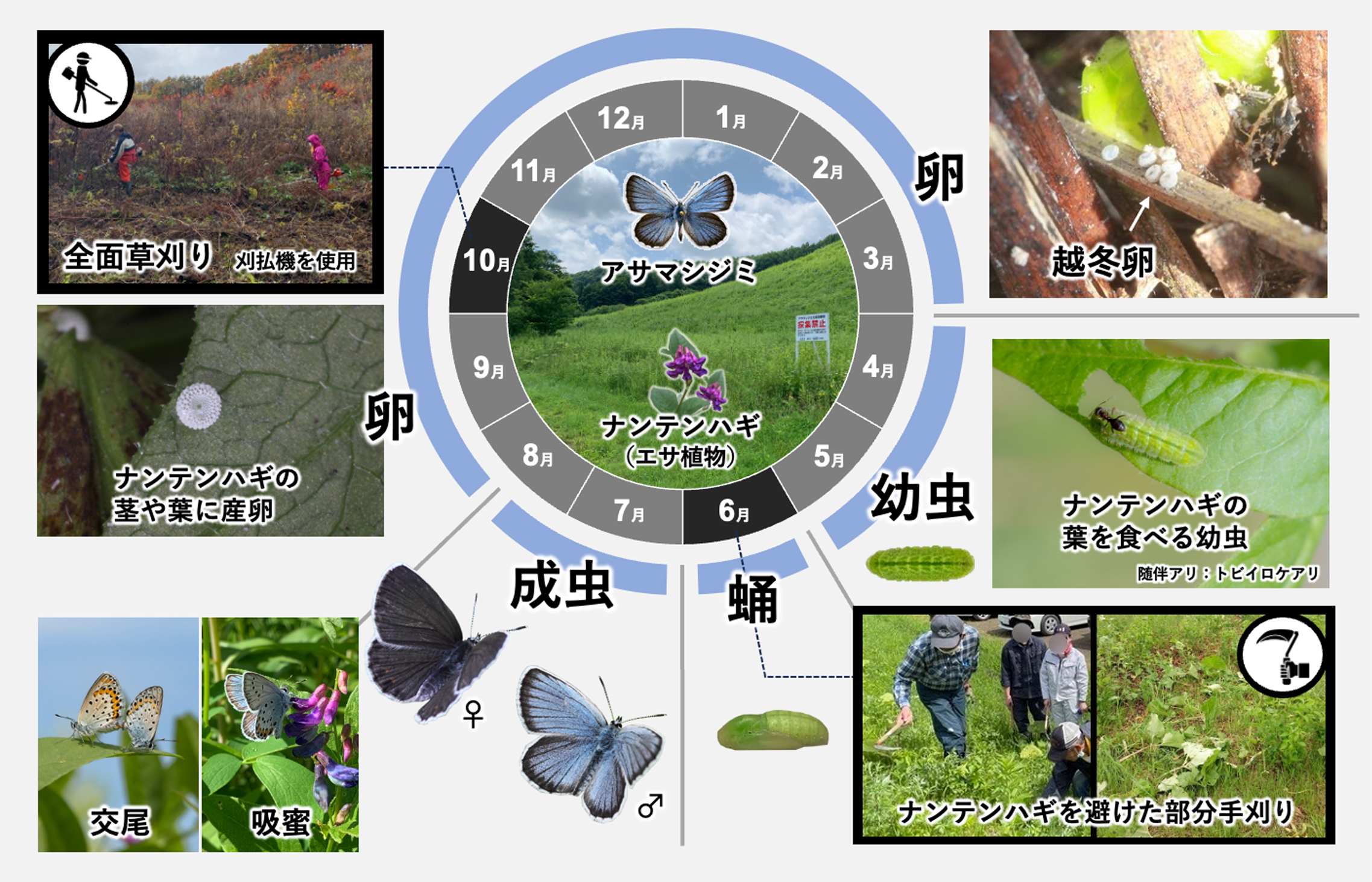図1: 研究概要(アサマシジミ北海道亜種の生活サイクルを踏まえた草刈り時期と方法)